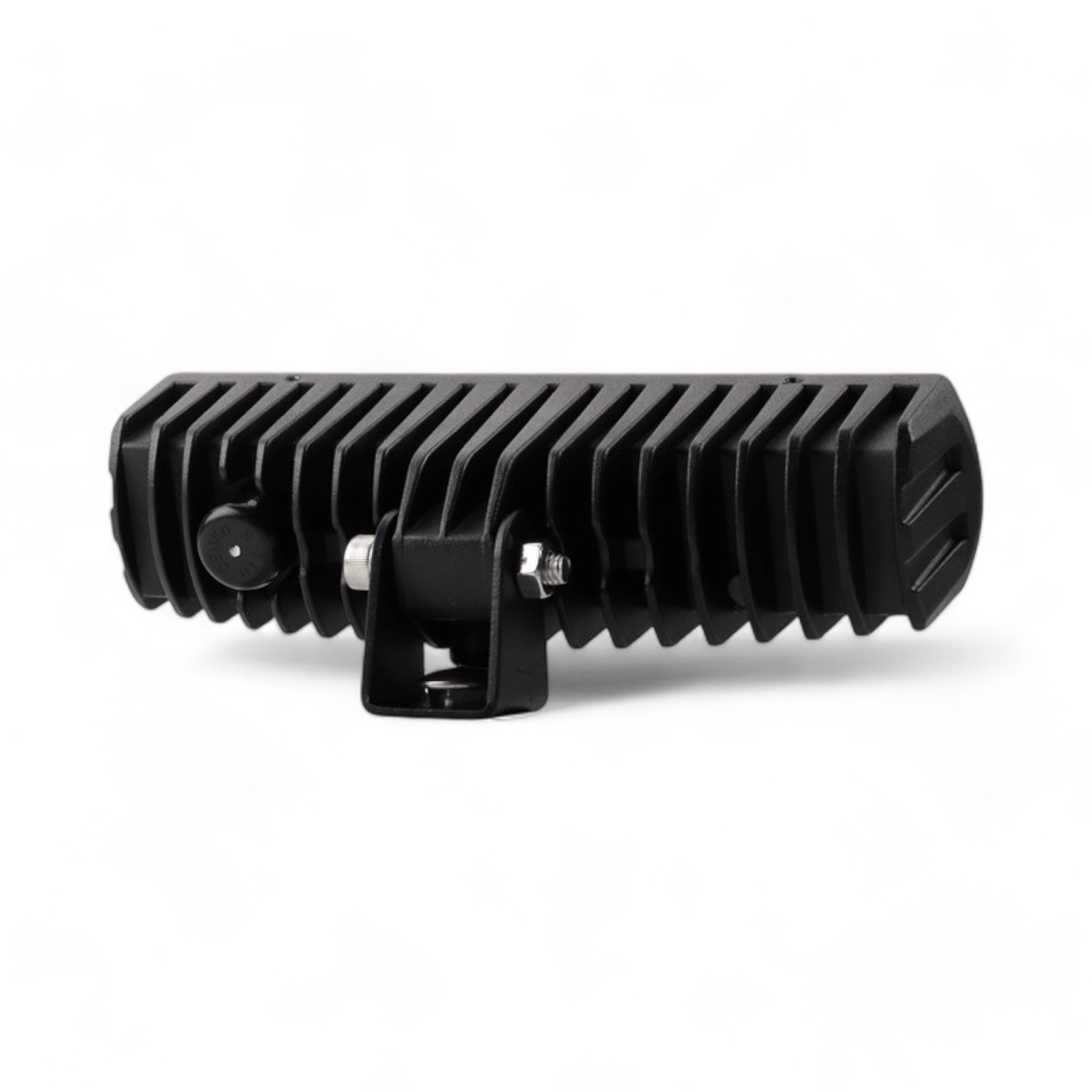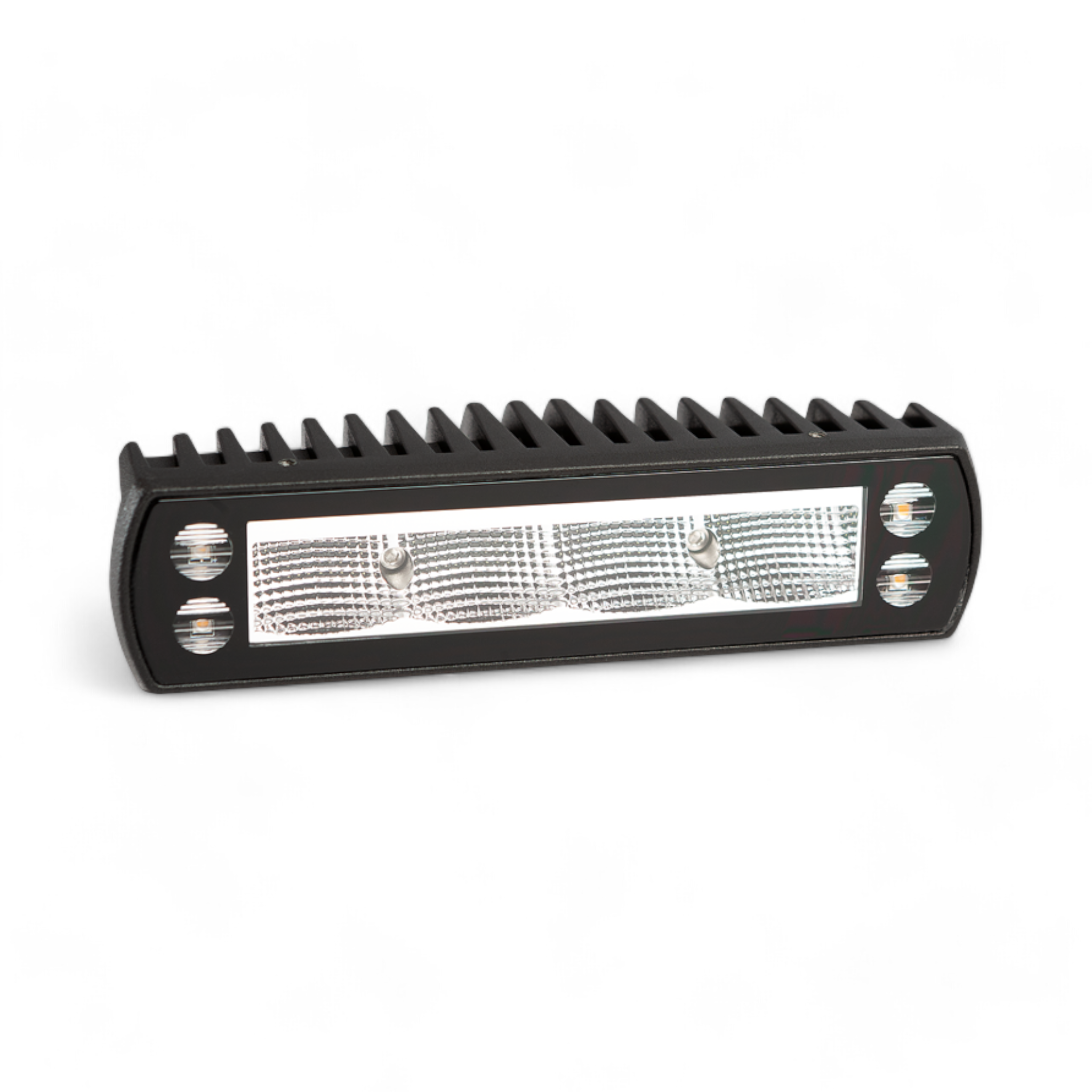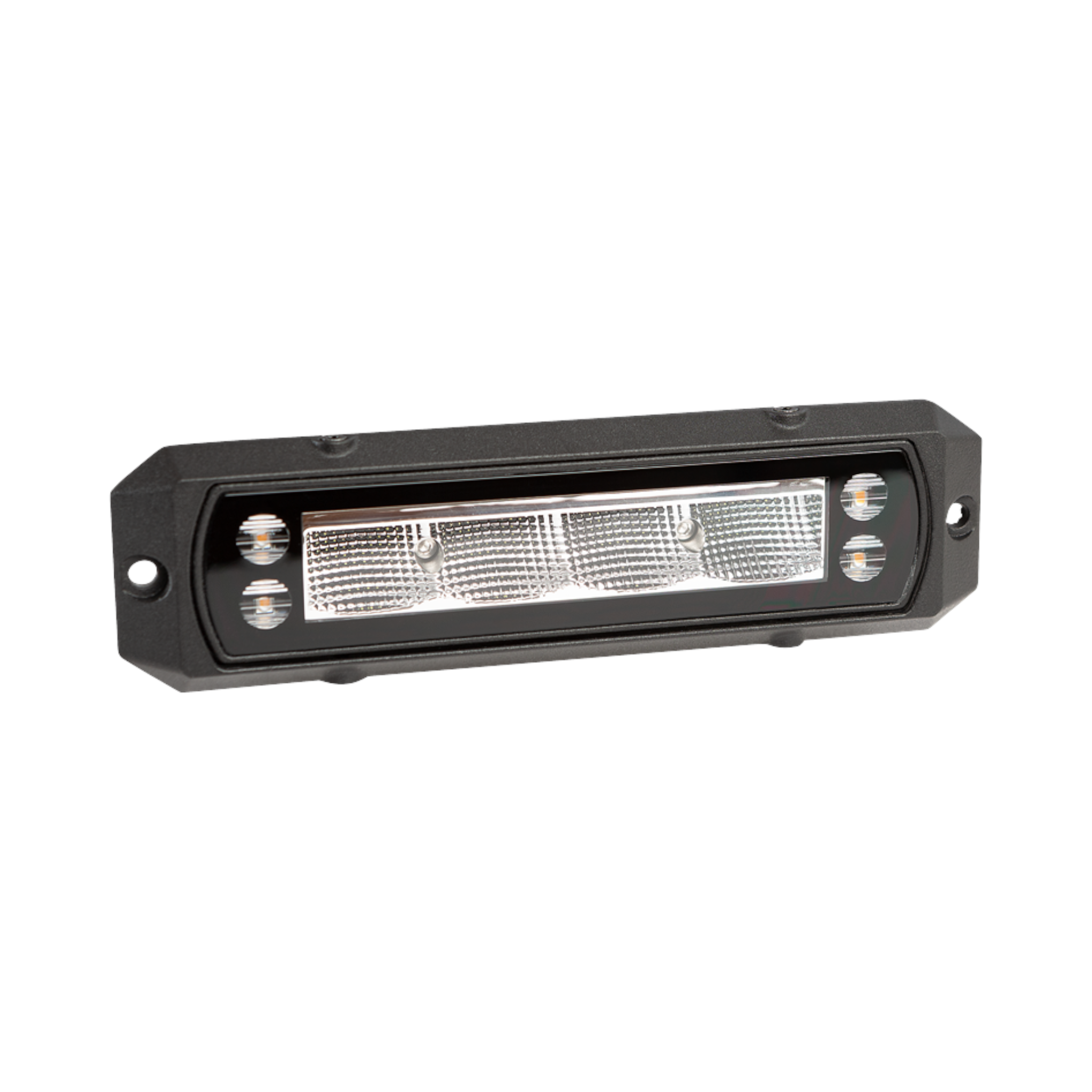 A lamp that combines work lighting and strobe light in one unit. It features an aluminum housing for optimal cooling and a polycarbonate lens for increased durability. The lamp is approved as a reverse light according to the ECE R23 standard. It comes with a U-bracket, a Deutsch DT4 connector, and a connection cable. An installation frame is included for mounting the lamp.