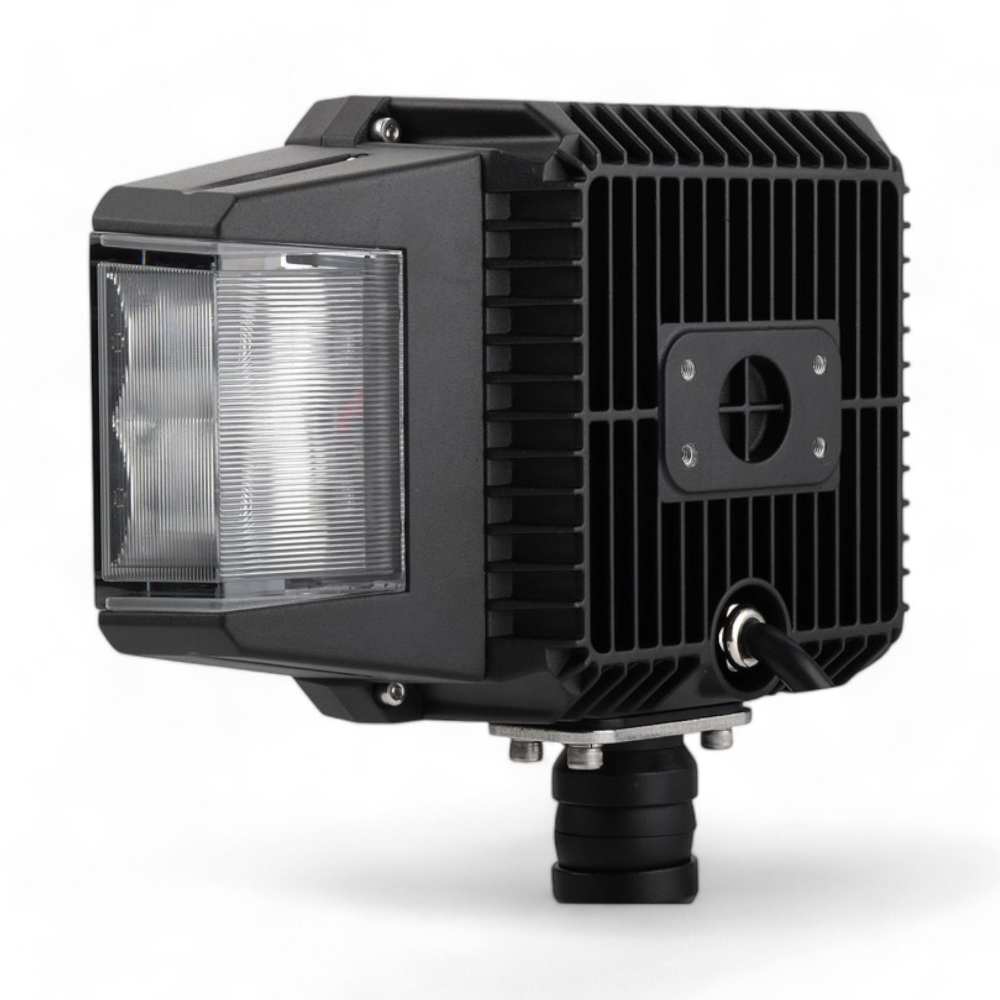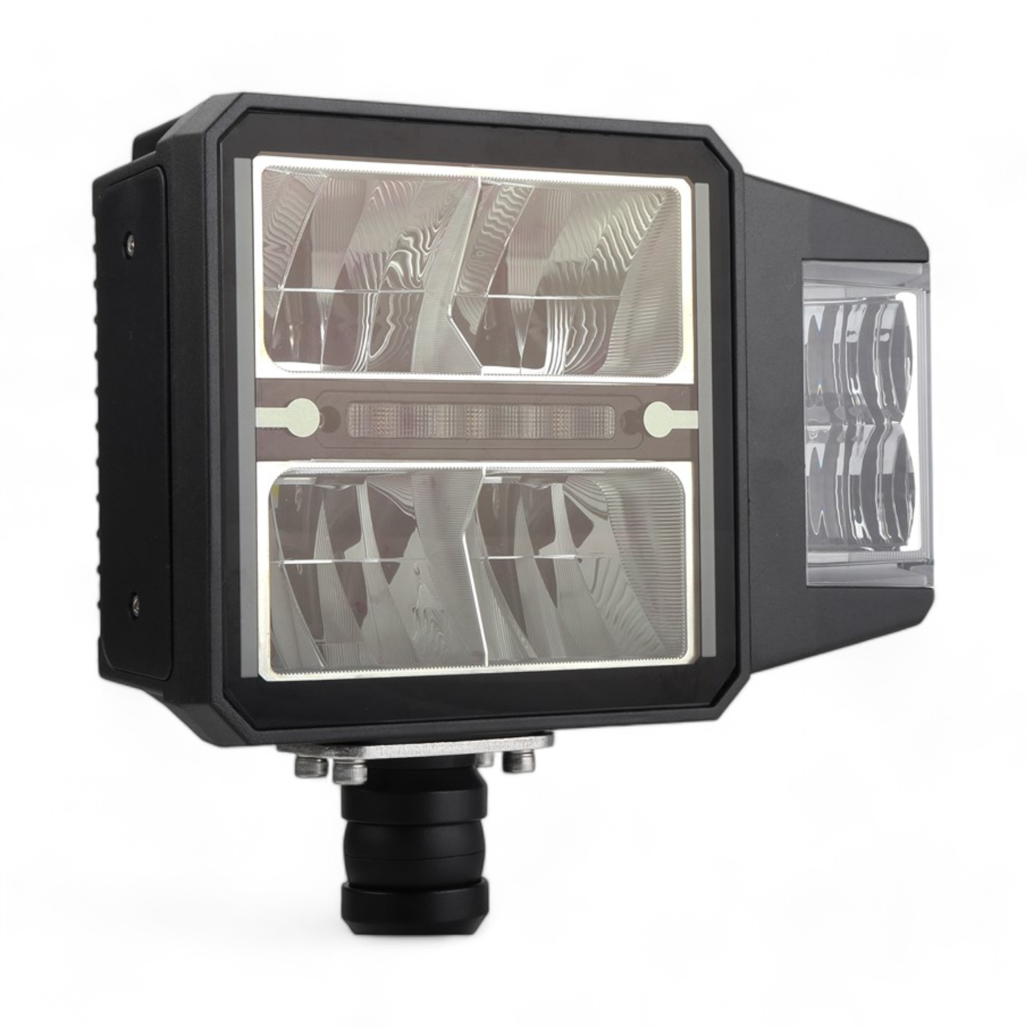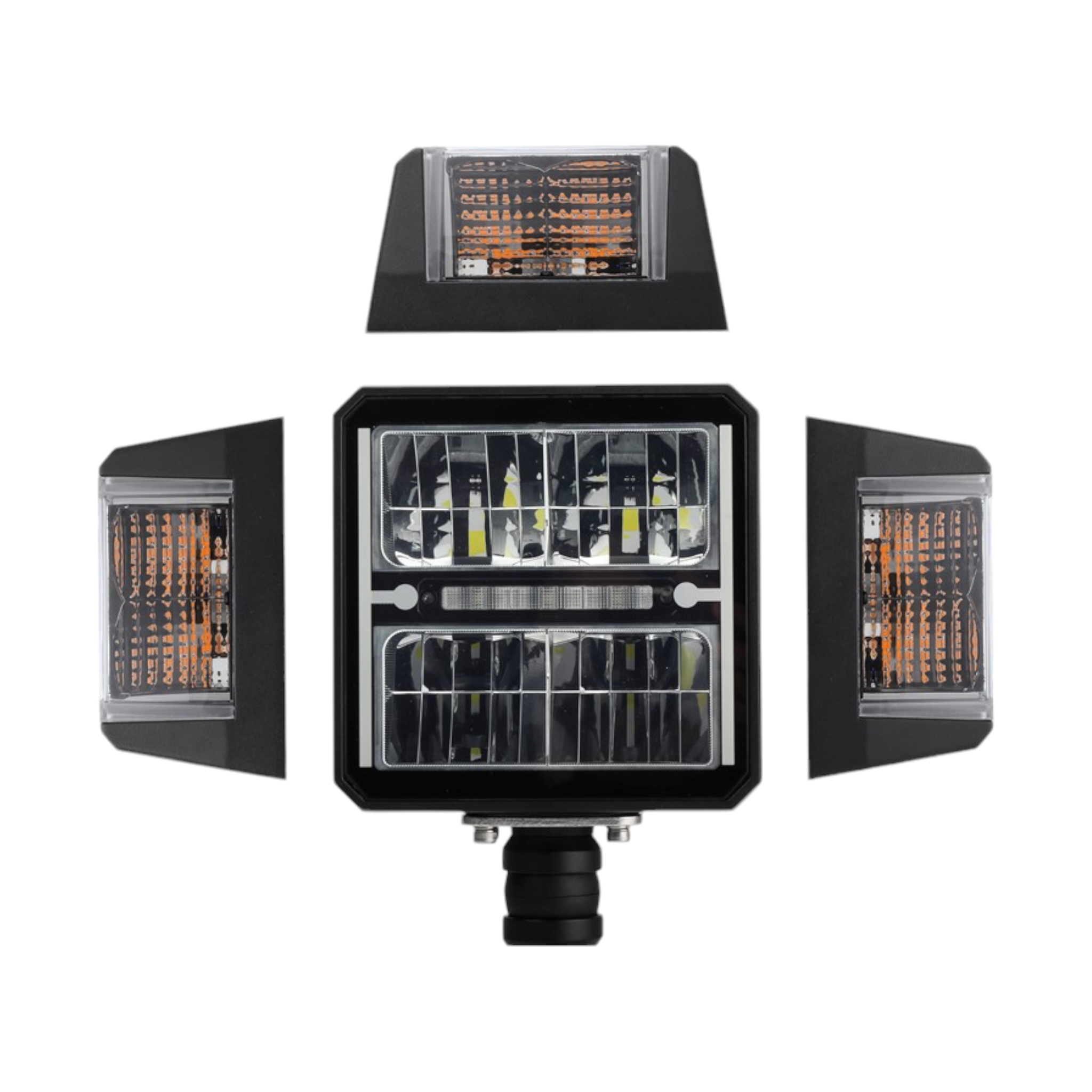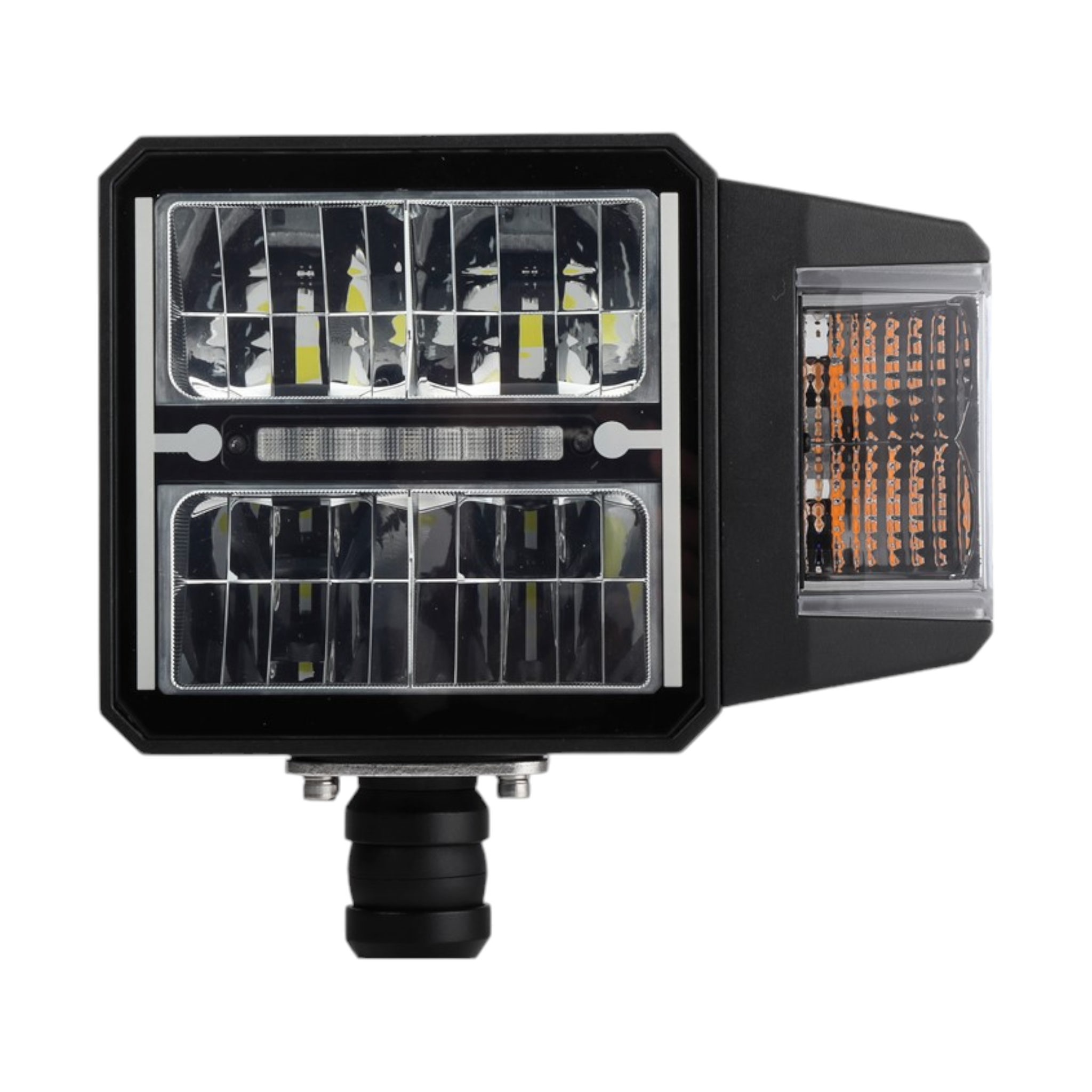 A flexible LED plow light with a heated lens that effectively melts ice and snow. The plow light features low beam, high beam, position light, and turn signals. The turn signal light can be mounted on the right, left, or top, depending on needs. The light is built with a robust aluminum housing and a durable polycarbonate lens. It is approved for ECE R112/R7/R6, DOT, CE, and RoHS.