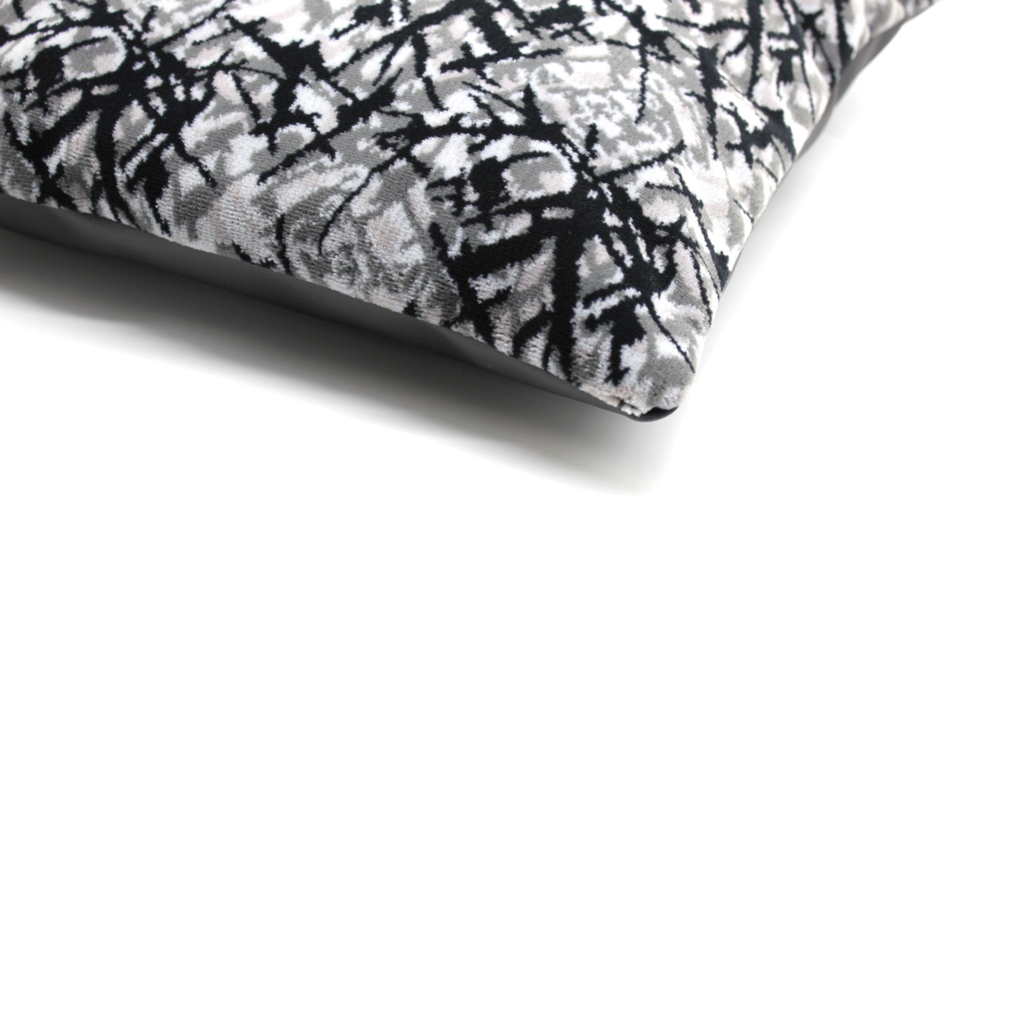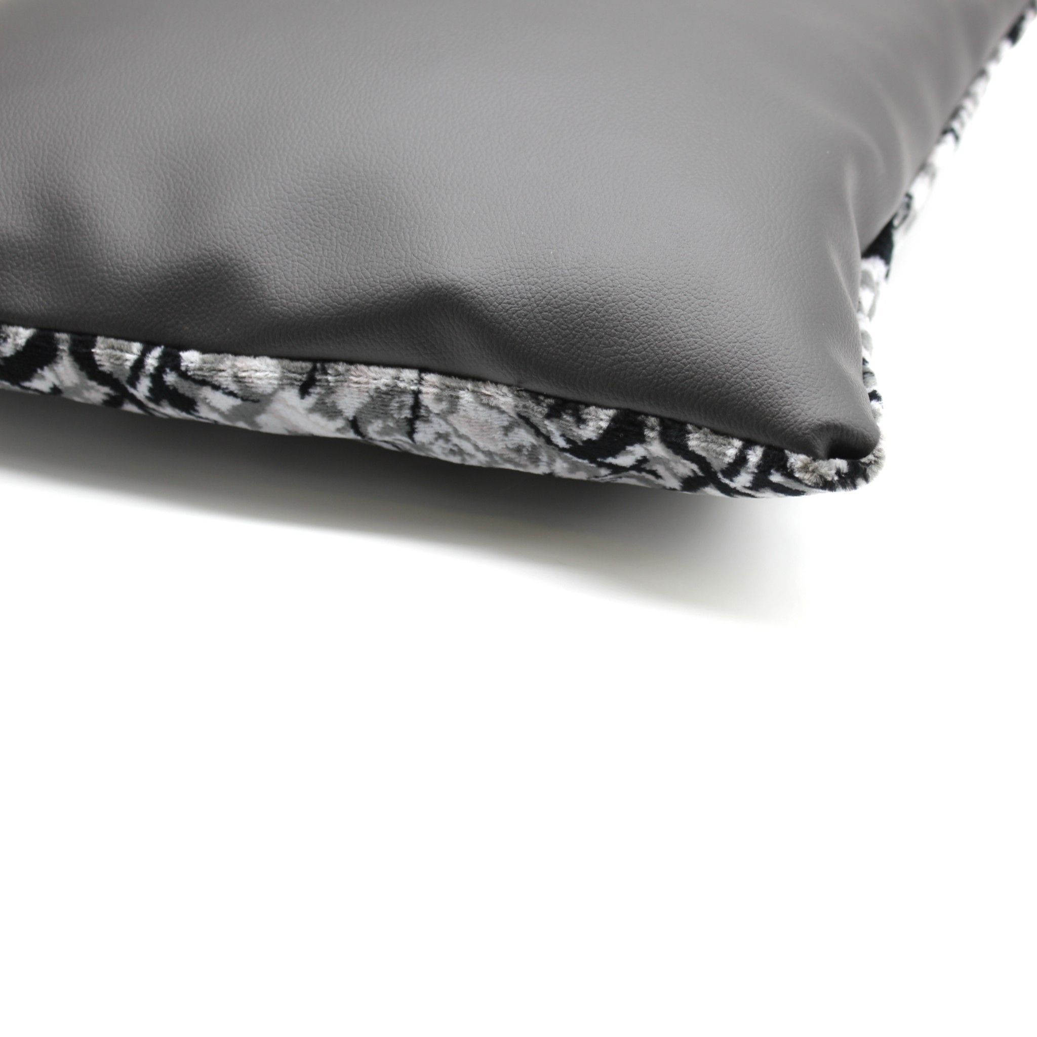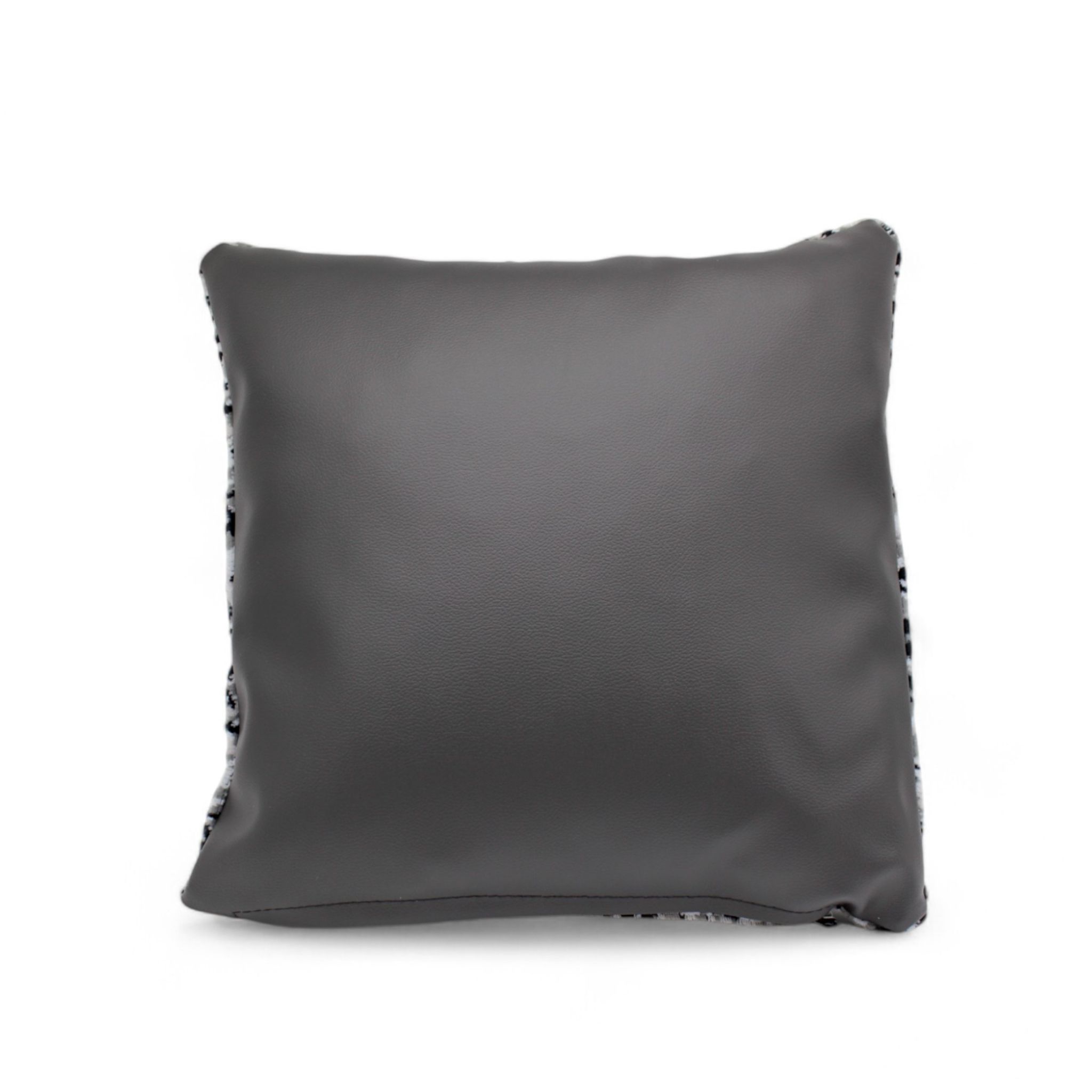 Cushion in grey danish plush fabric for decoration. The cushion is made of high-quality materials, featuring a durable and classic danish plush with timeless patterns on the front, while the back is made of black leather, providing a luxurious finish.