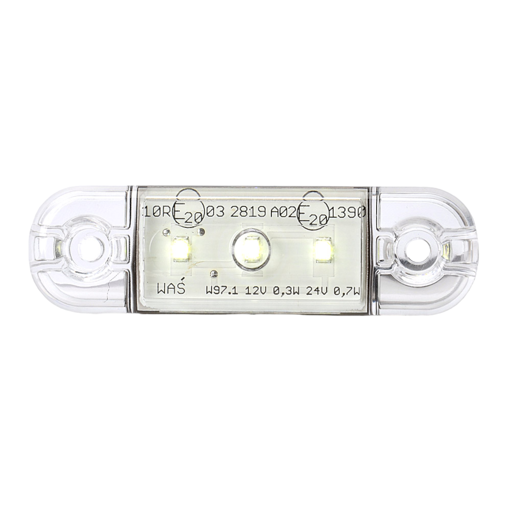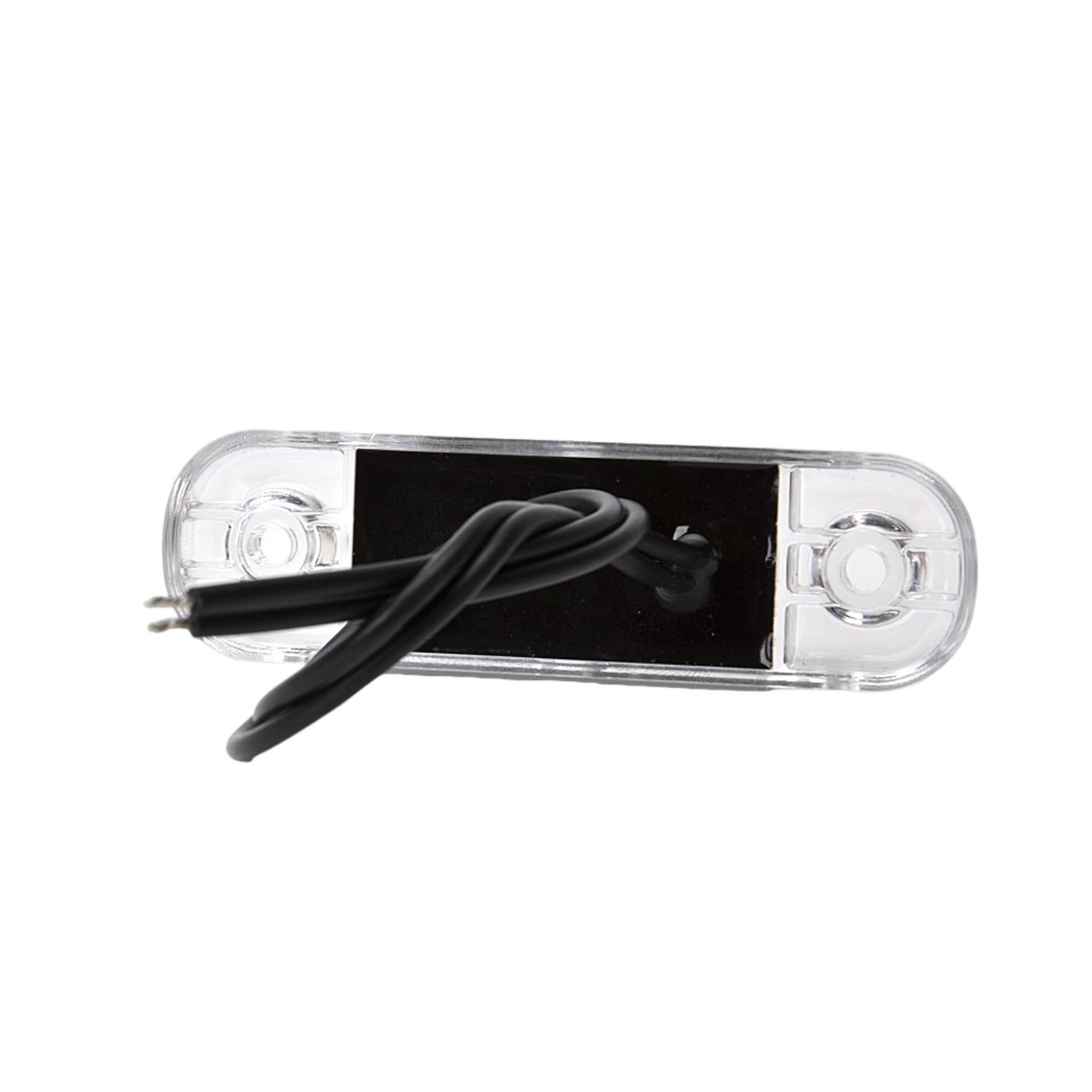 Slimmad Vit LED positionsljus för utanpåliggande montage. E-godkänd. SPECIFIKATIONER Kabel (m): 0.4m BxHxD (mm): 84 x 24 x 10mm CC mått: 61mm Dioder (st): 3st Lamptyp: LED Anslutning: Kabel Volt (V): 12-24v