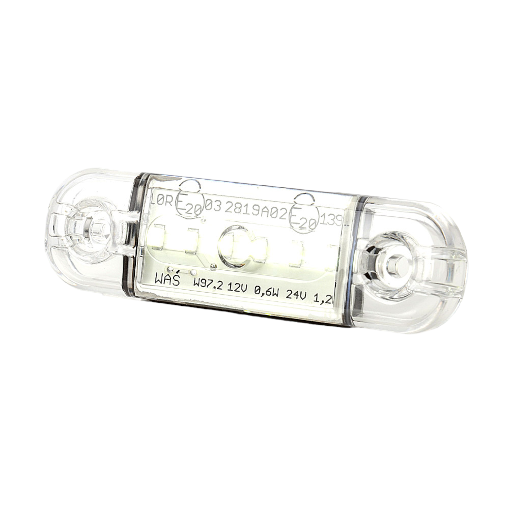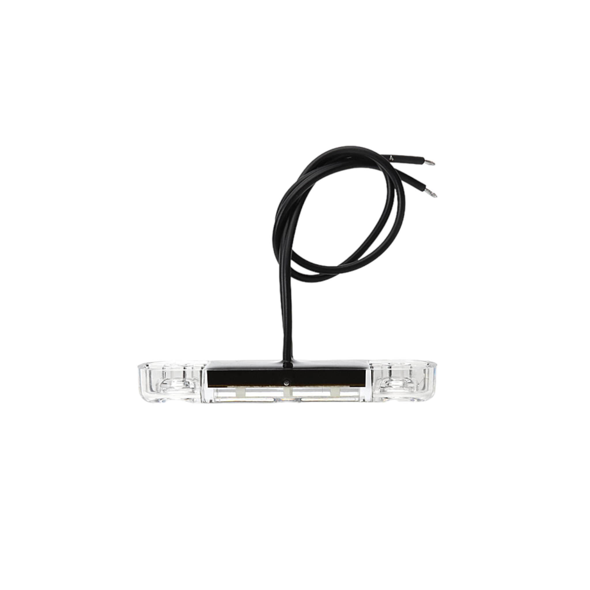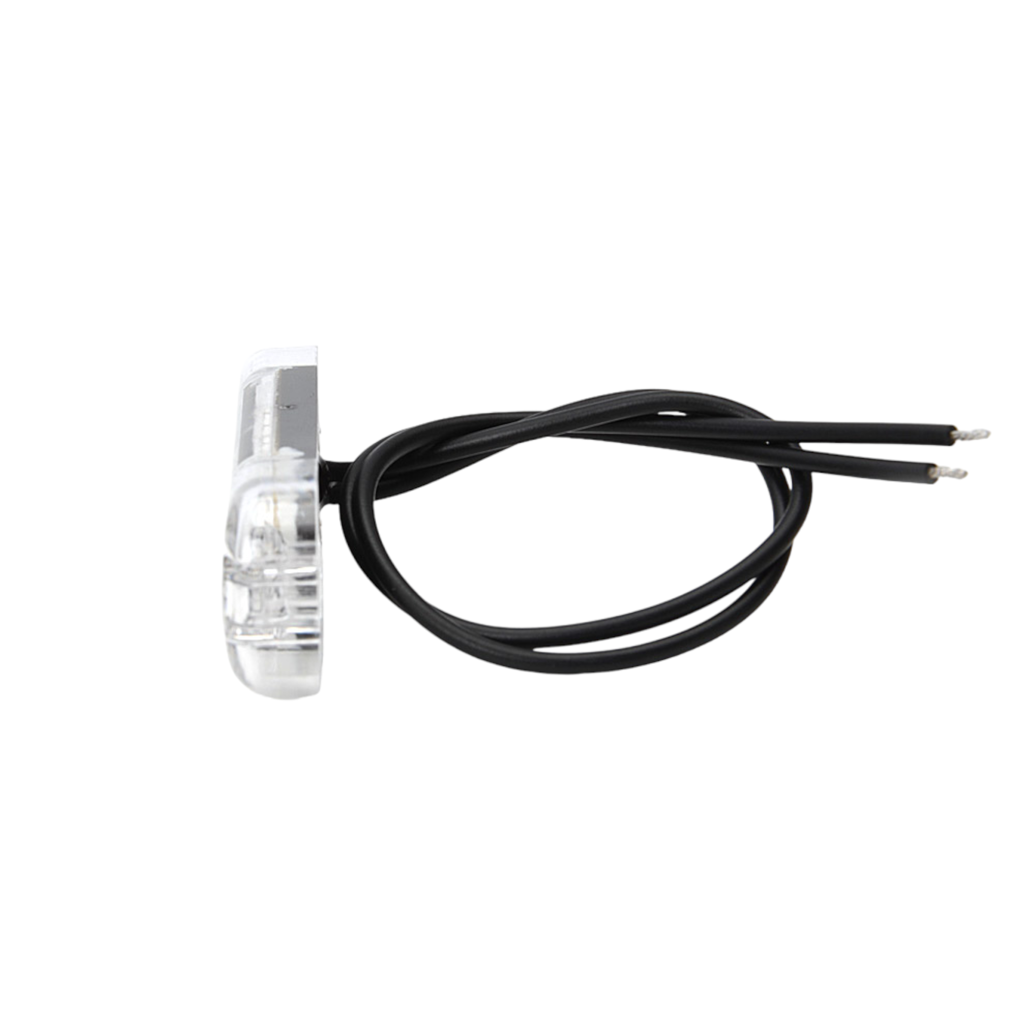 Slimmad Vit LED positionsljus för utanpåliggande montage. E-godkänd. SPECIFIKATIONER Kabel (m): 0.4m BxHxD (mm): 84 x 24 x 10mm CC mått: 61mm Dioder (st): 6st Lamptyp: LED Anslutning: Kabel Volt (V): 12-24v