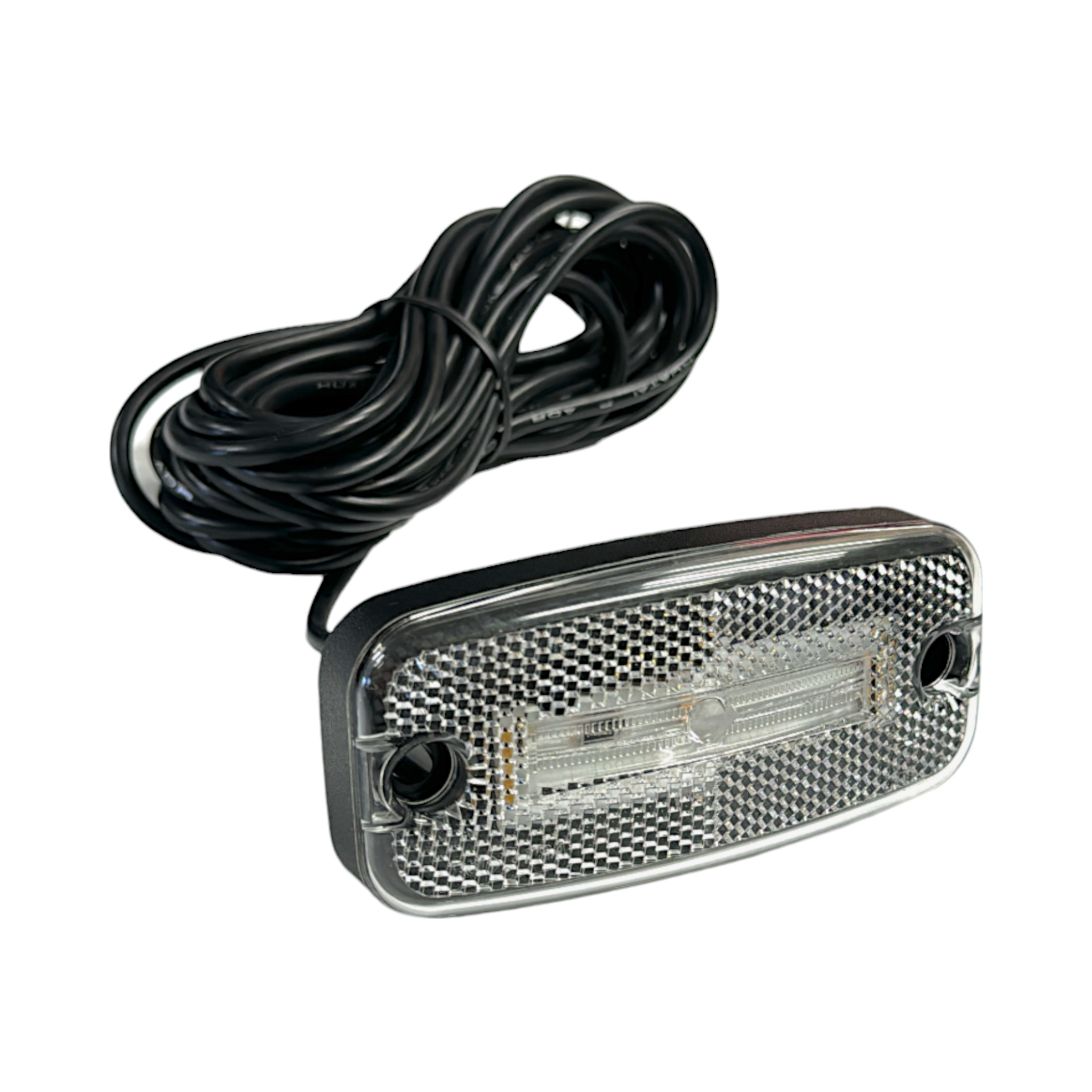 E-godkänd vit fiberoptisk positionsljuslampa med reflex inbyggt. Helt vattentät tack vare ultraljudssvetsningen vid kabelns ingång på baksidan. Levereras med 5meter kabel.