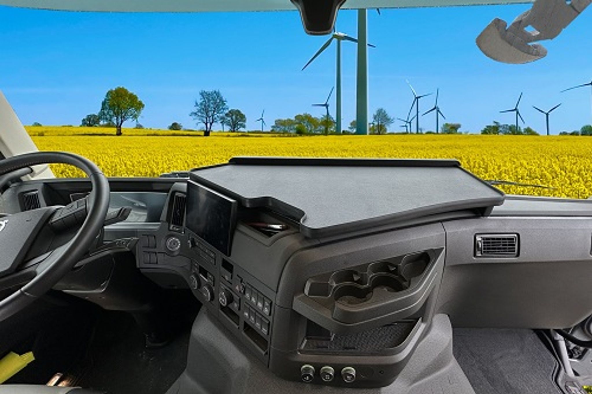 A load-bearing table for Volvo FM5 & FMX5. With pre-assembled kit and easy installation in existing mounting points, no drilling required. Safety-calculated design with rounded edges and free ventilation outlets. Frame material in poplar wood.
