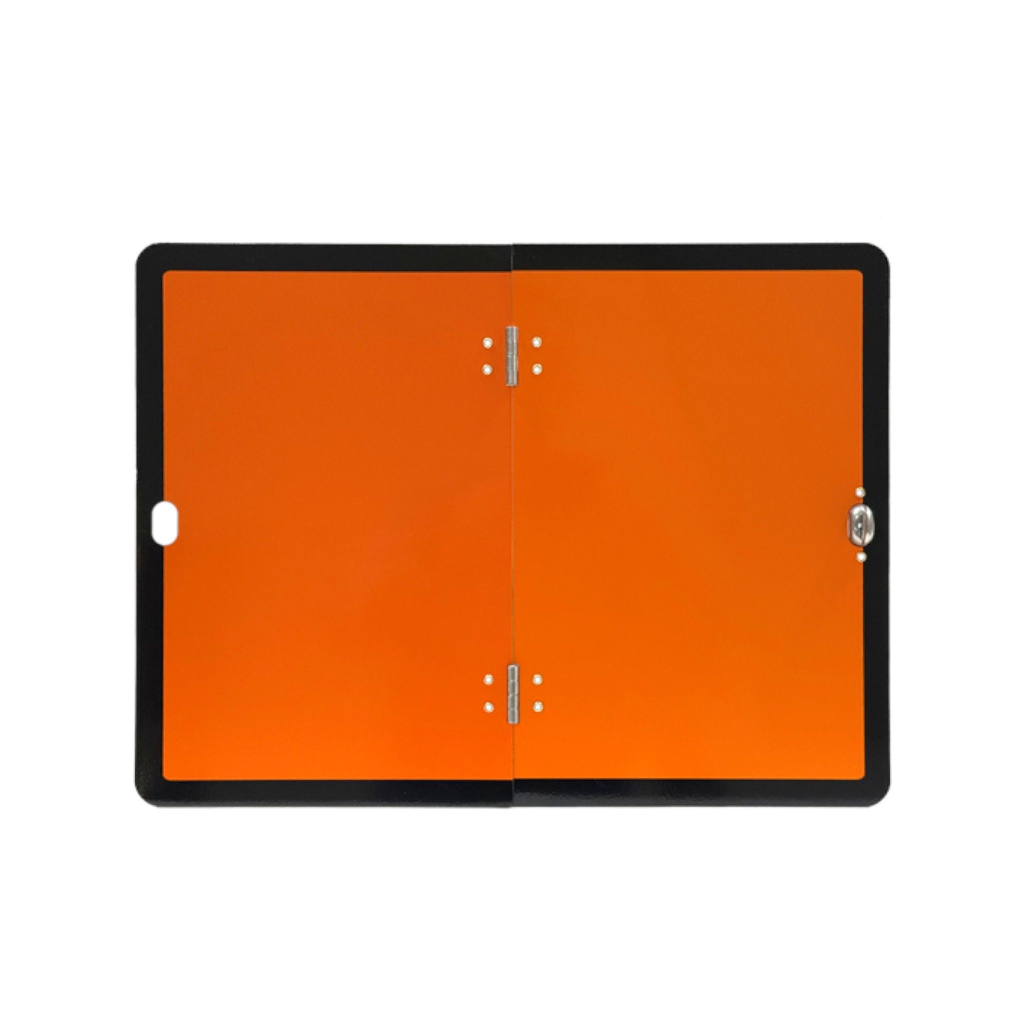 Vikbar ADR skylt - farligt gods med måtten 400×300 mm, tillverkad i rostfri plåt.