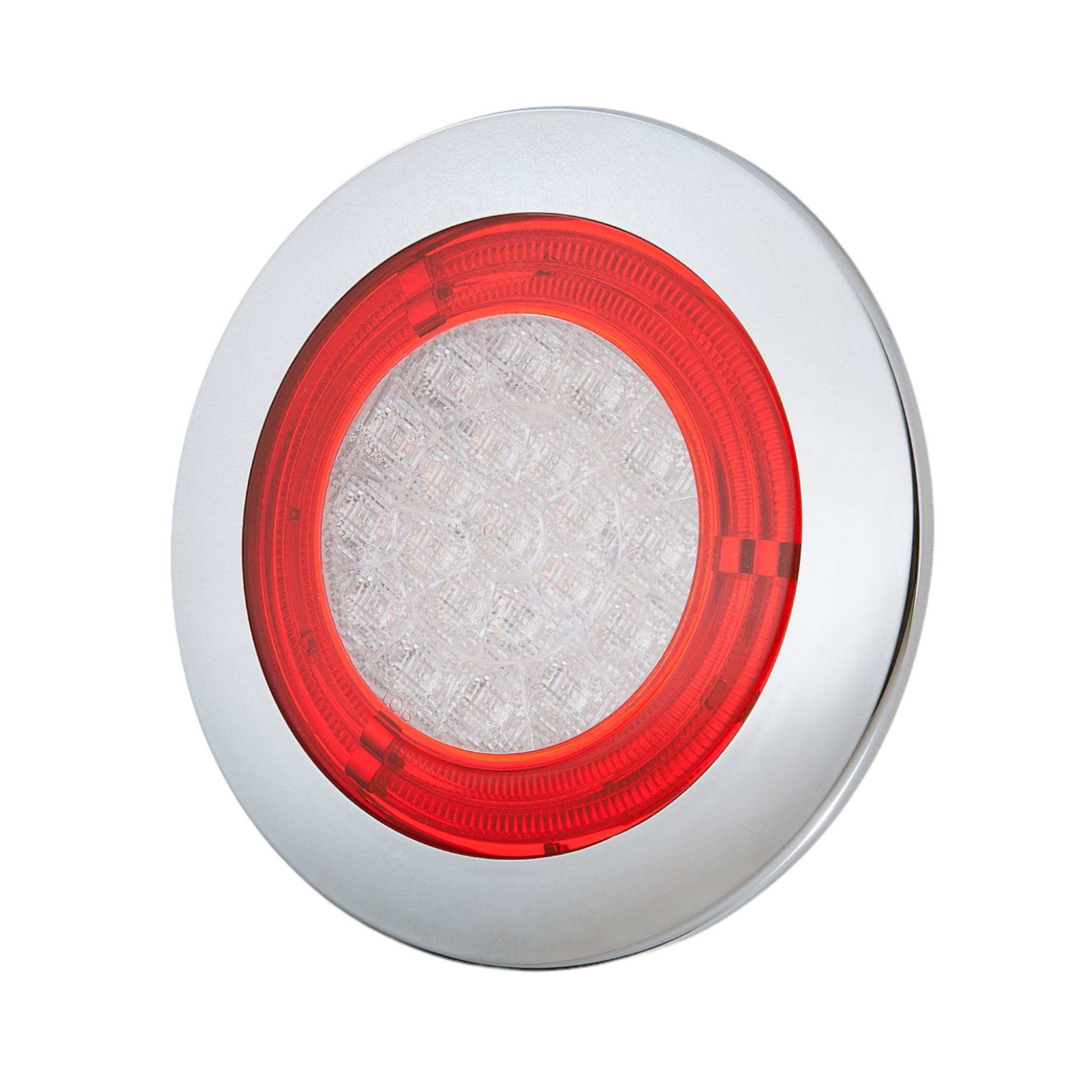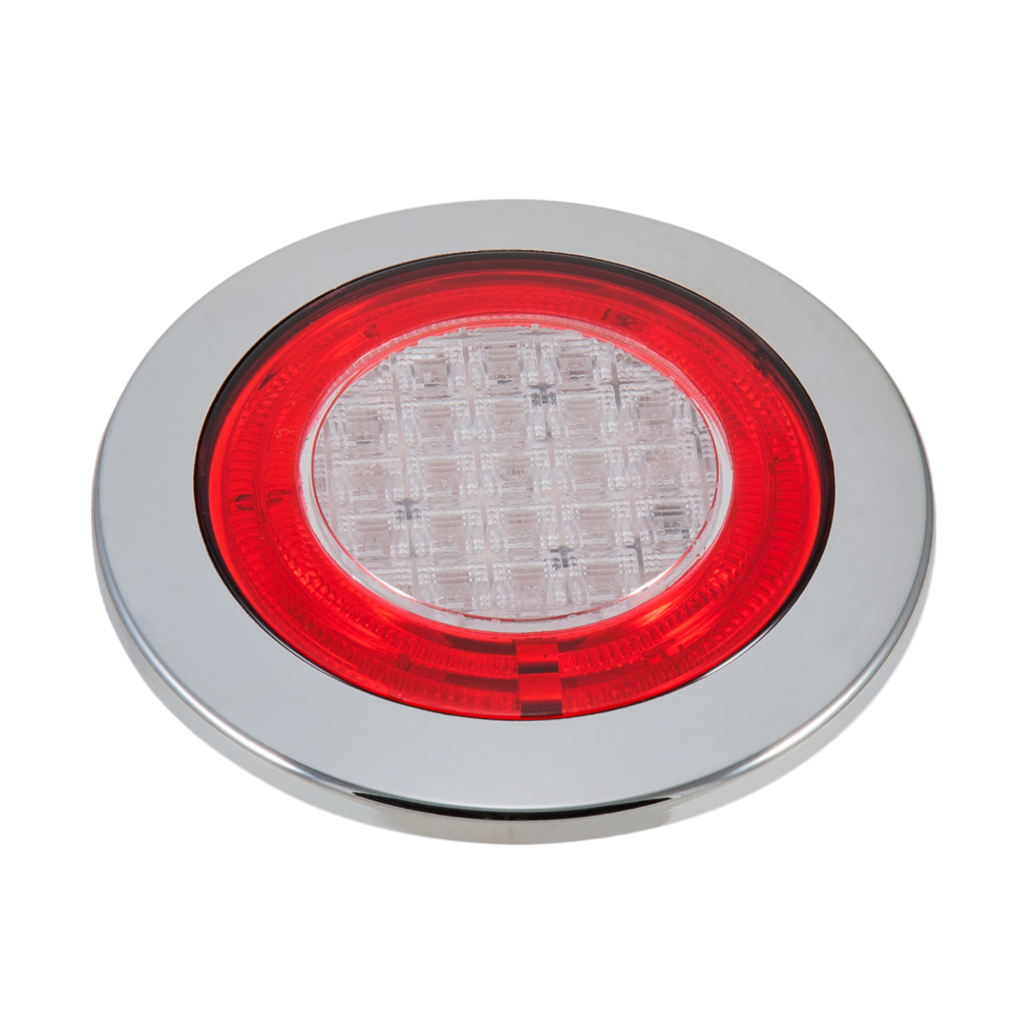 Rund 155mm baklampa för inbyggnad. Denna modell har fiberoptiskt bakljus i ring runt om och dioder i mitten. E-godkänd. Kromring ingår.