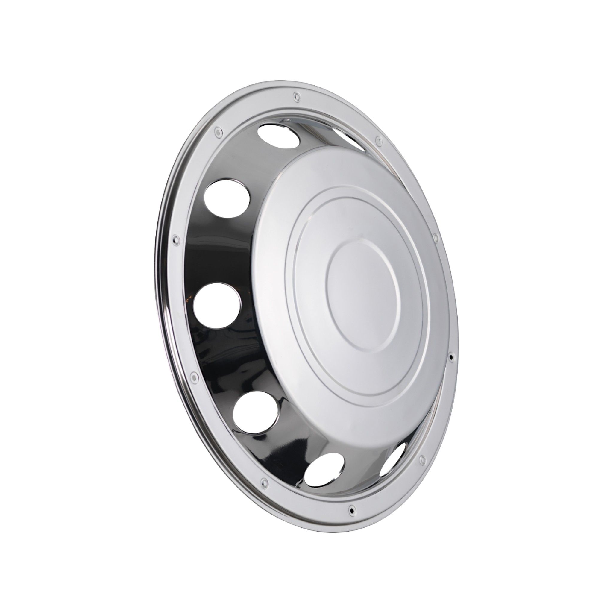 Hjulkapsel i blankpolerat rostfritt stål, för montering på framaxel.Passar fälgar i storleken 17.5"Monteras enkelt på fälgkanten med den medföljande fästringen.