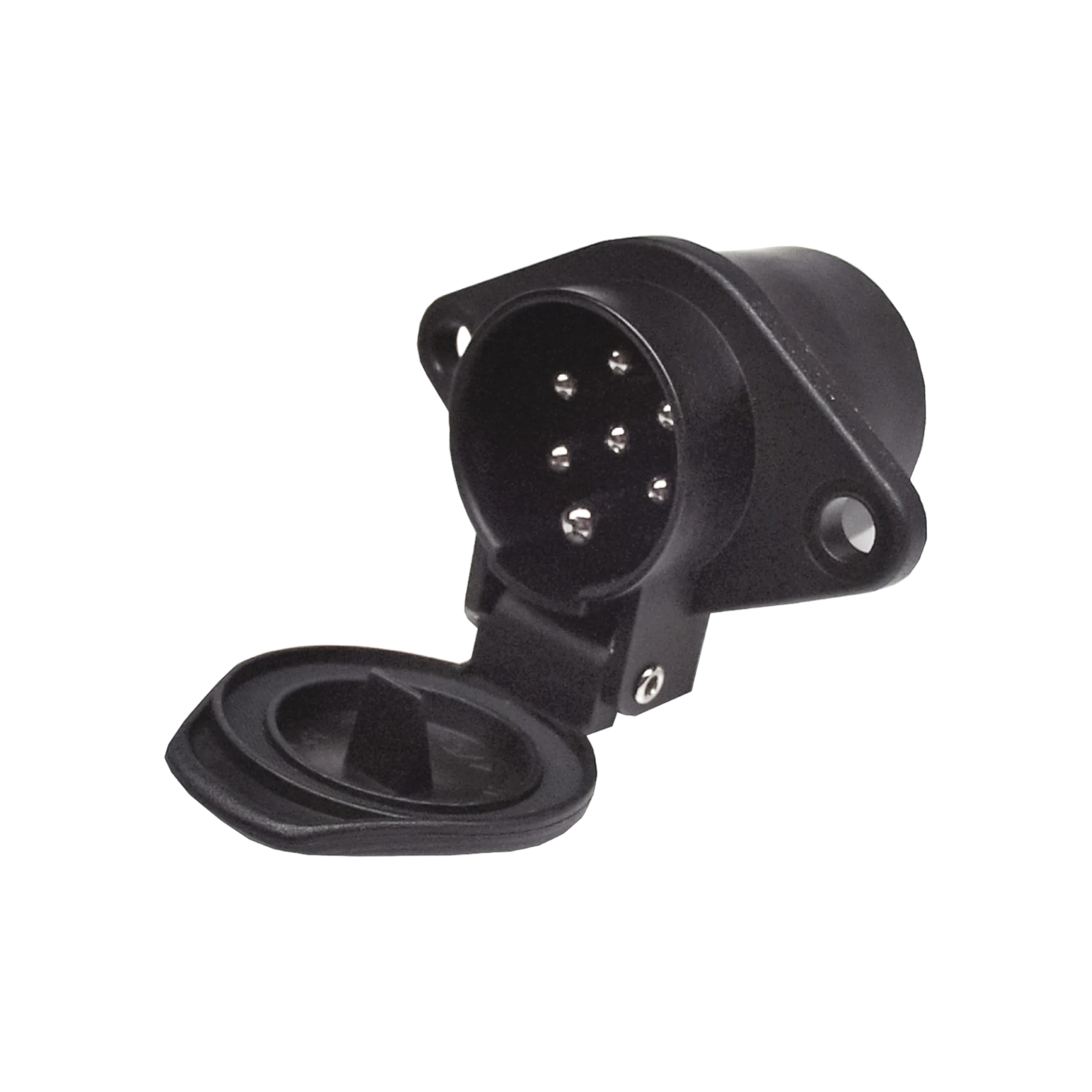 7-polig kontaktdosa av svart nylon i slagfast utförande med skruvanslutning. Dosa med fjädrande lock. 2 fästhål, cc 75 mm. Mått för infällning: diameter 50 mm, djup 60 mm. 24 V. ISO 1185. Kontaktdosa med stift. Levereras med gummitätning.