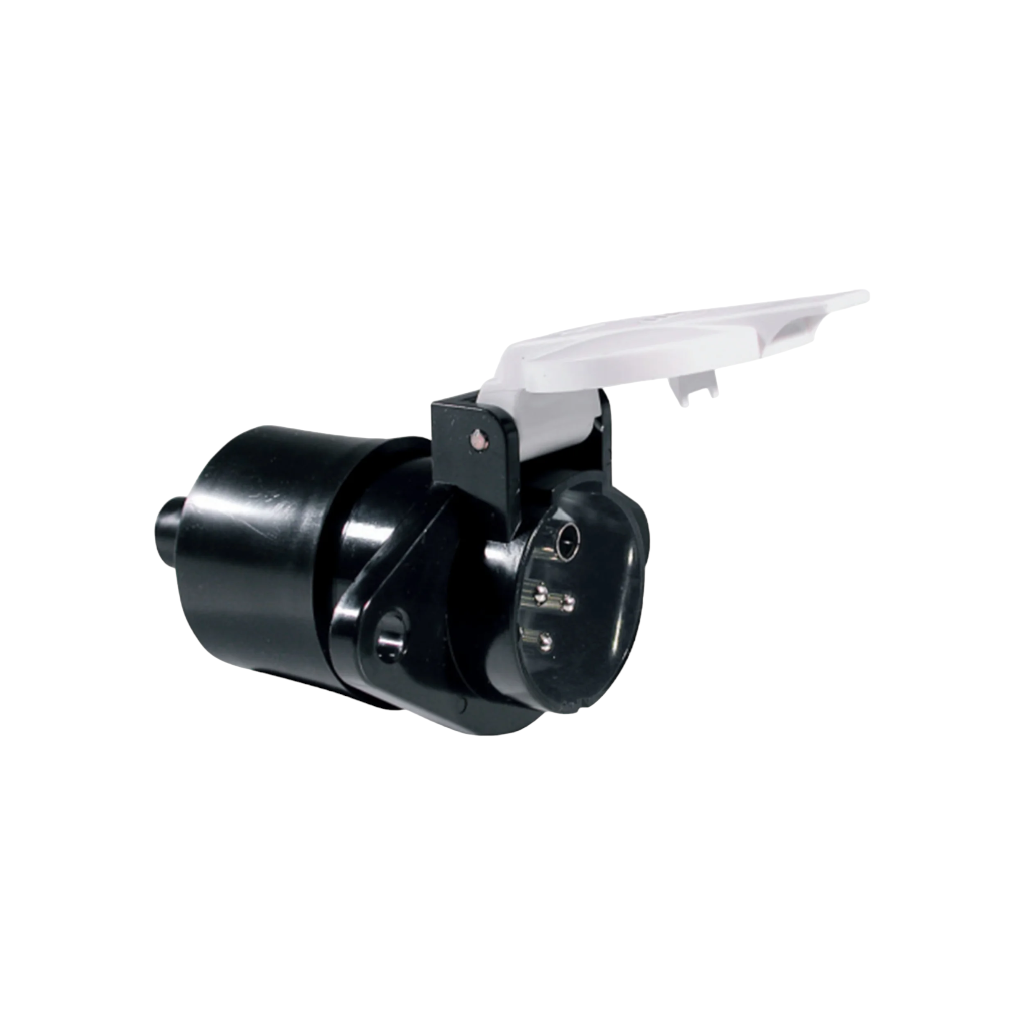 7-polig kontaktdosa (6 stift, 1 hylsa) av plast i slagtåligt utförande med gummitätning och fjädrande lock. 2 fästhål, cc 75 mm. Mått för infällning: diameter 47 mm, djup inkl. tätning 80 mm. 24 V. ISO 3731. Med skruvanslutning.