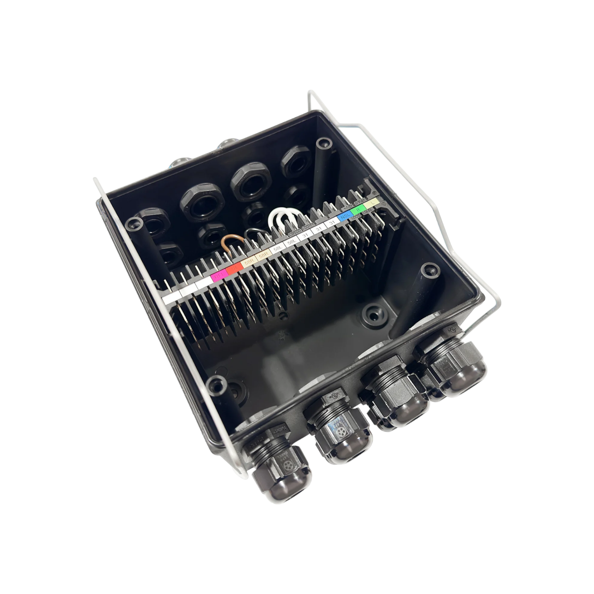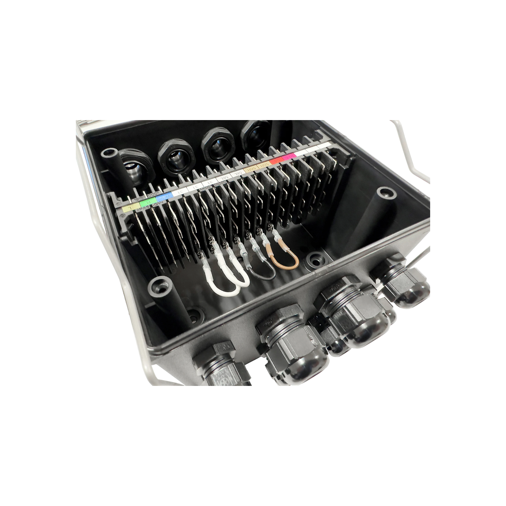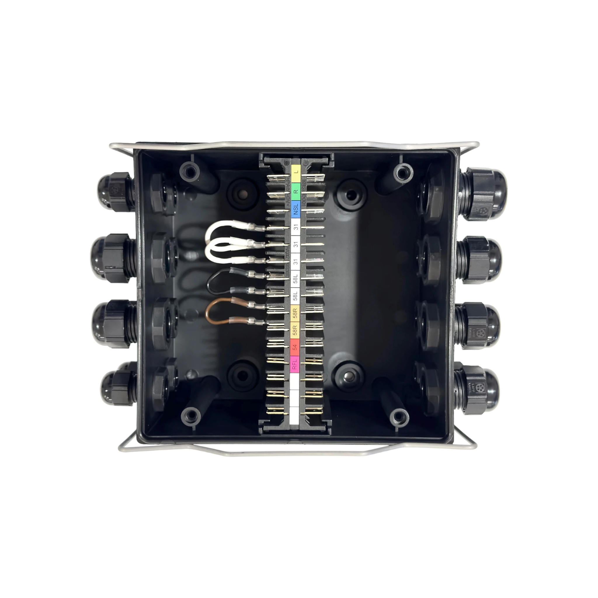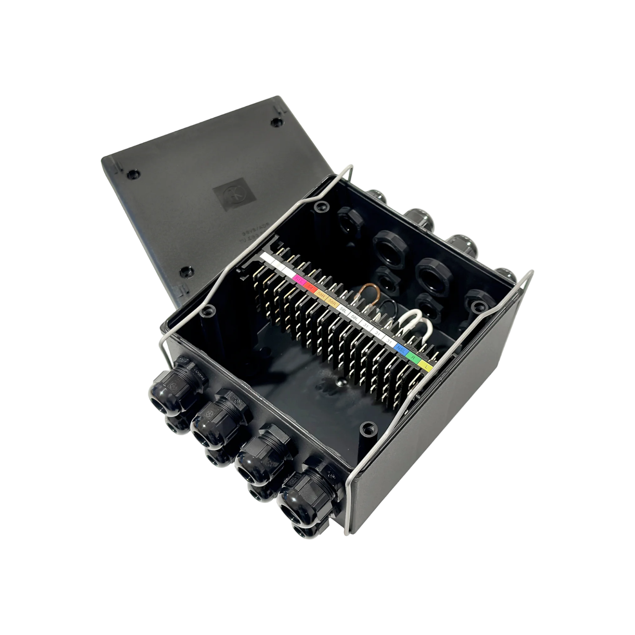 Av svart plast i vattentätt utförande. Bestyckad med 15-polig kopplingsplint med 4 + 4 flatstiftsanslutningar per pol. 16 st kabelingångar (10 x PG9 + 5 x PG13 + 1 x PG16 monterade). Storlek 167 x 157 mm. Höjd 99 mm. Tätningsklass IP69K. ADR-godkänd.