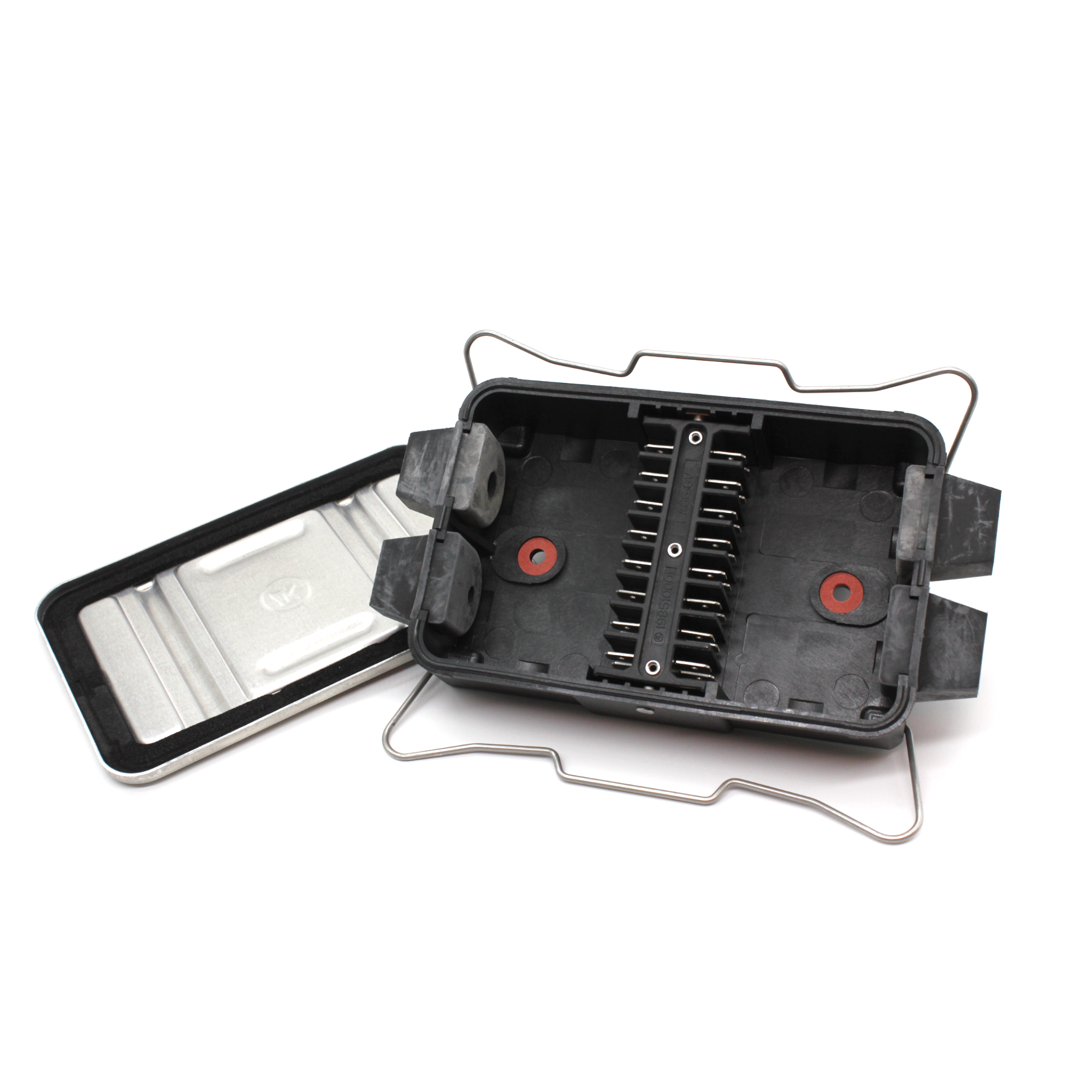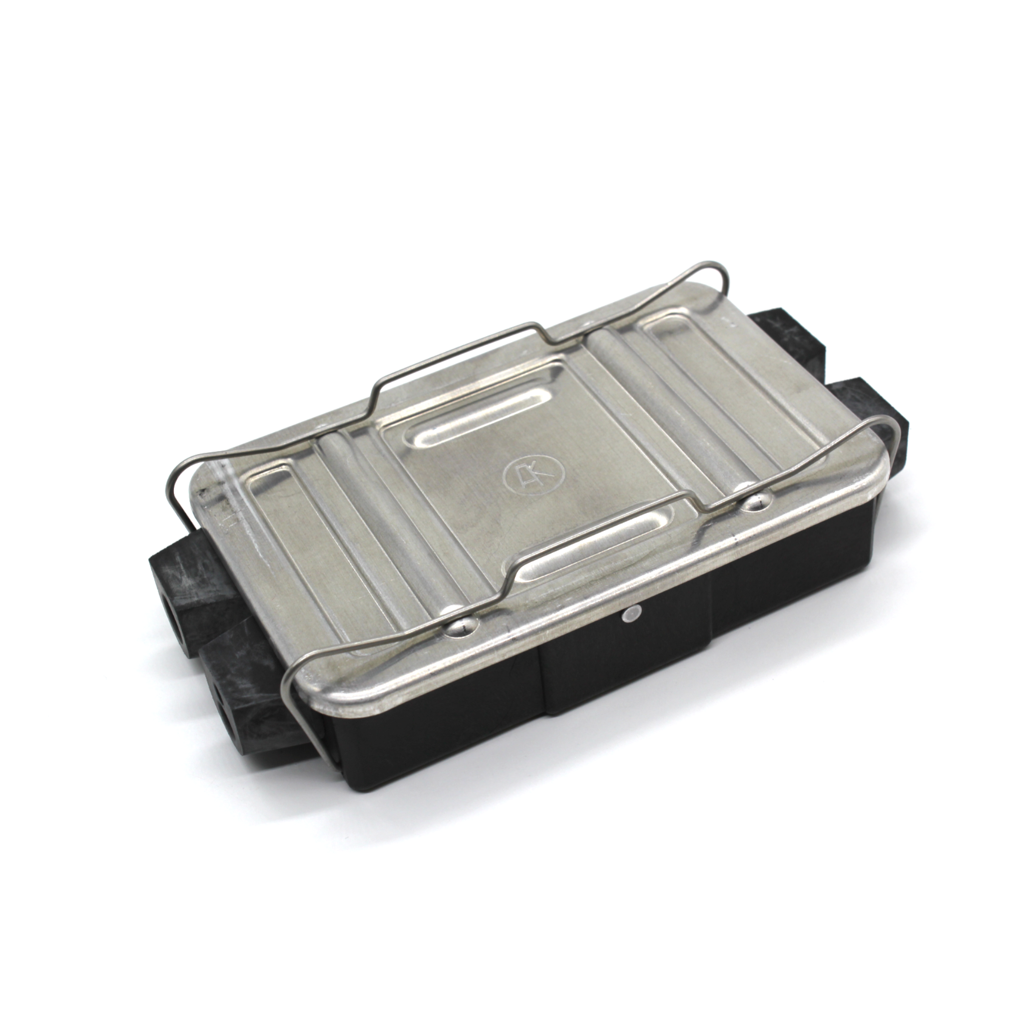 Kopplingsbox med en 8x4 kopplingsplint, 32st flatstiftanslutningar. Tillverkad av bakelit med lock utav aluminium. Kopplingsdosan har 4 kabelingångar, kabelgenomföringar medföljer.