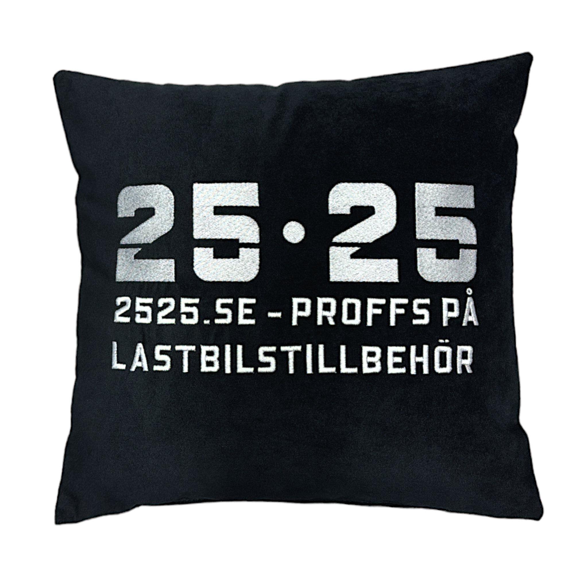 Snygg kudde i svart alcantara likande tyg med våran 25•25 logotyp samt text undertill broderat, perfekt som dekoration i lastbilen.