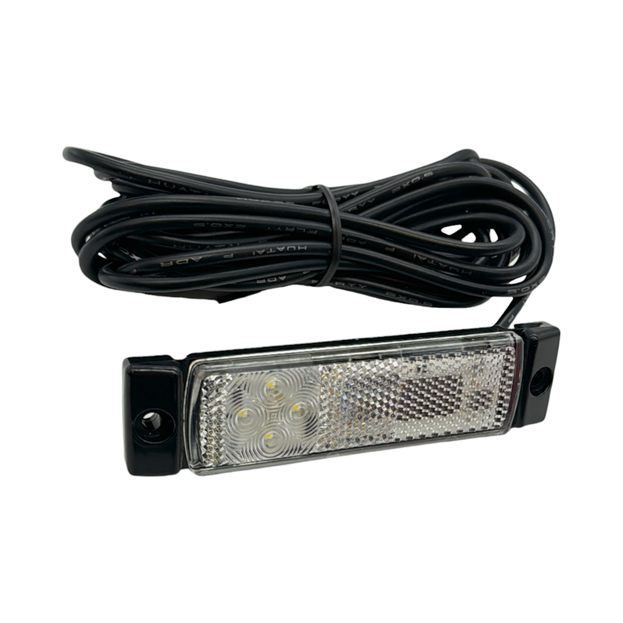 E-godkänd vit LED positionsljuslampa med reflex inbyggt. Helt vattentät tack vare ultraljudssvetsningen vid kabelns ingång på baksidan. Levereras med 5meter kabel.