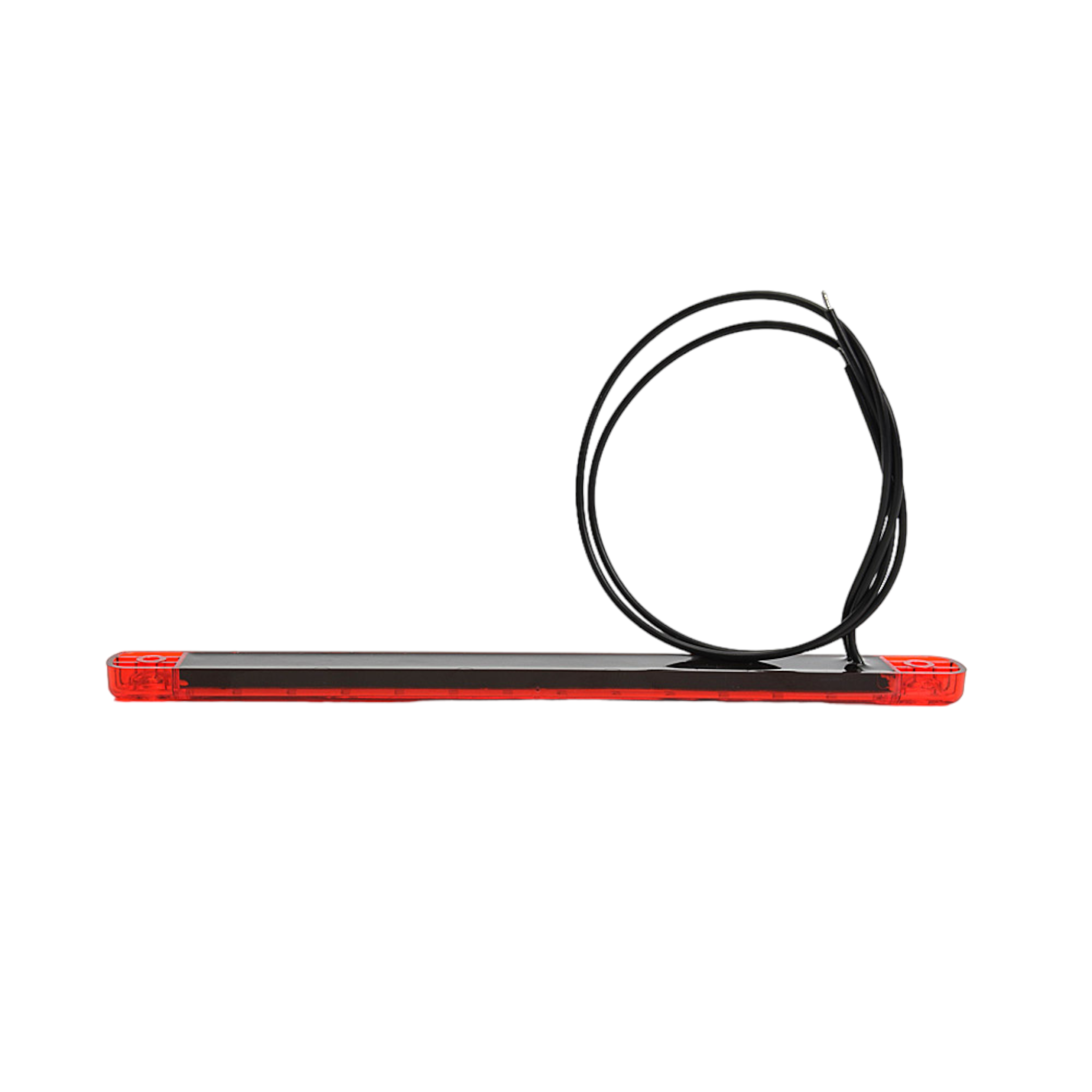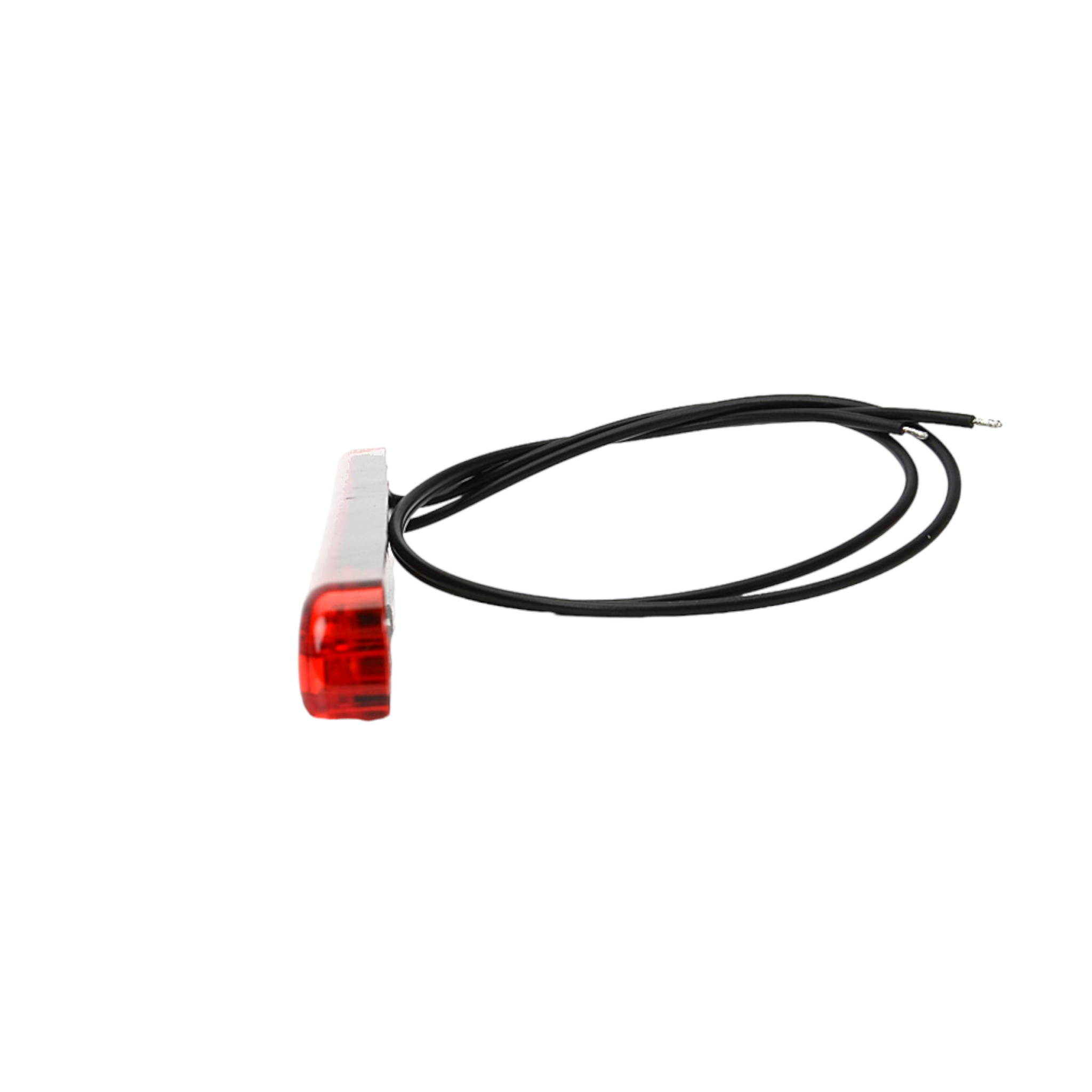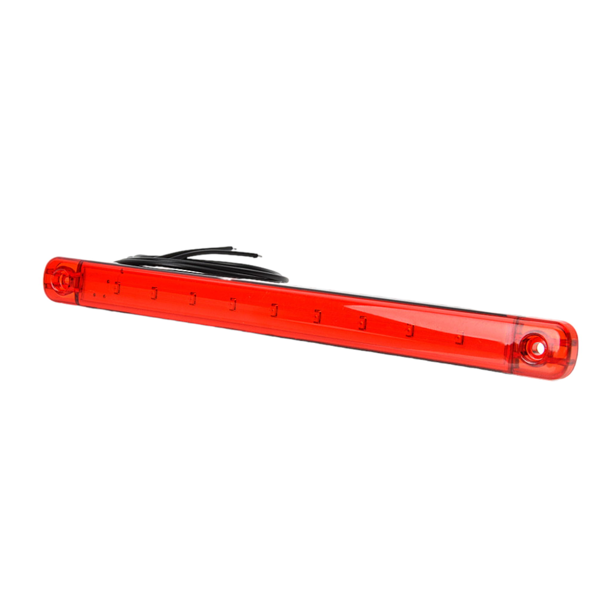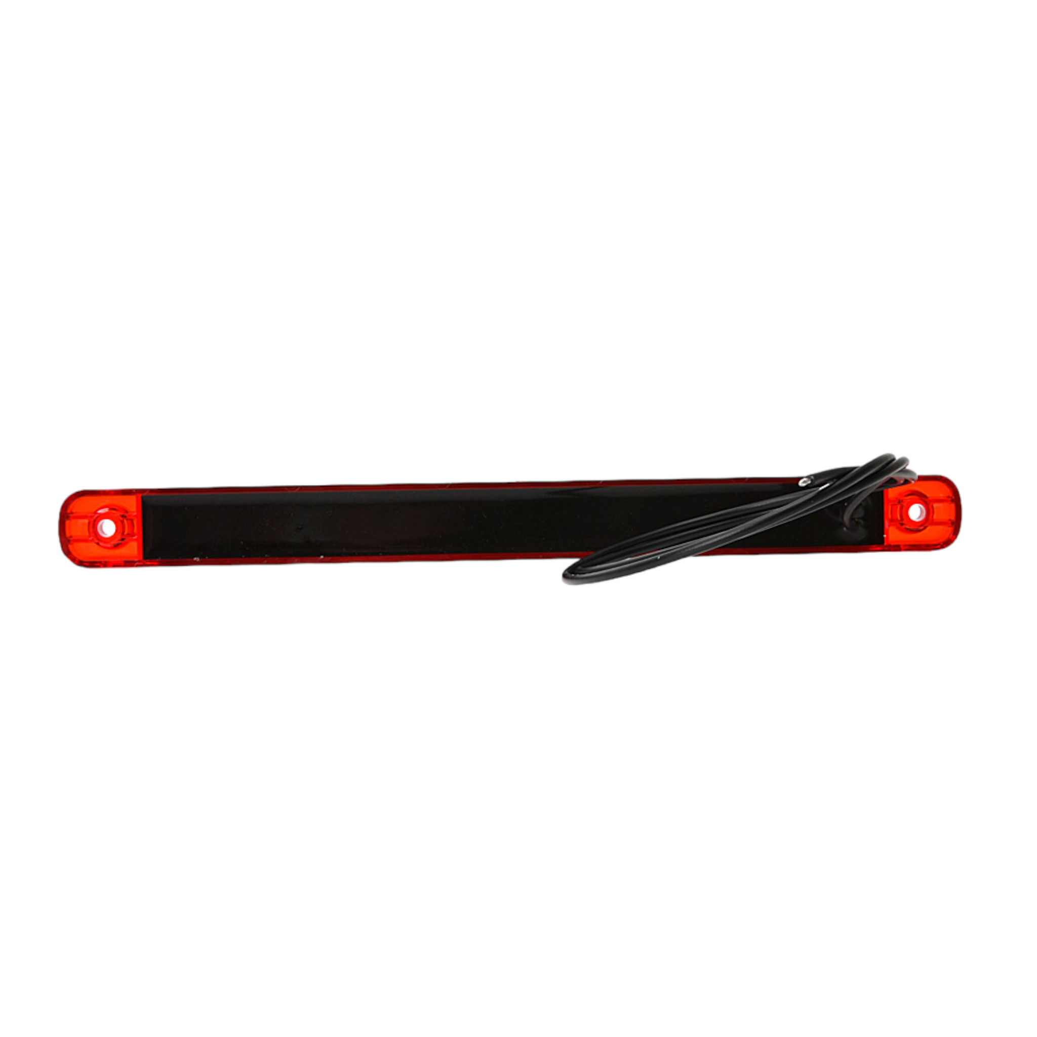 Slimmad Röd LED positionsljus för utanpåliggande montage. E-godkänd. SPECIFIKATIONER Kabel (m): 0.4m BxHxD (mm): 238 x 24 x 10mm CC mått: 213mm Dioder (st): 9st Lamptyp: LED Anslutning: Kabel Volt (V): 12-24v