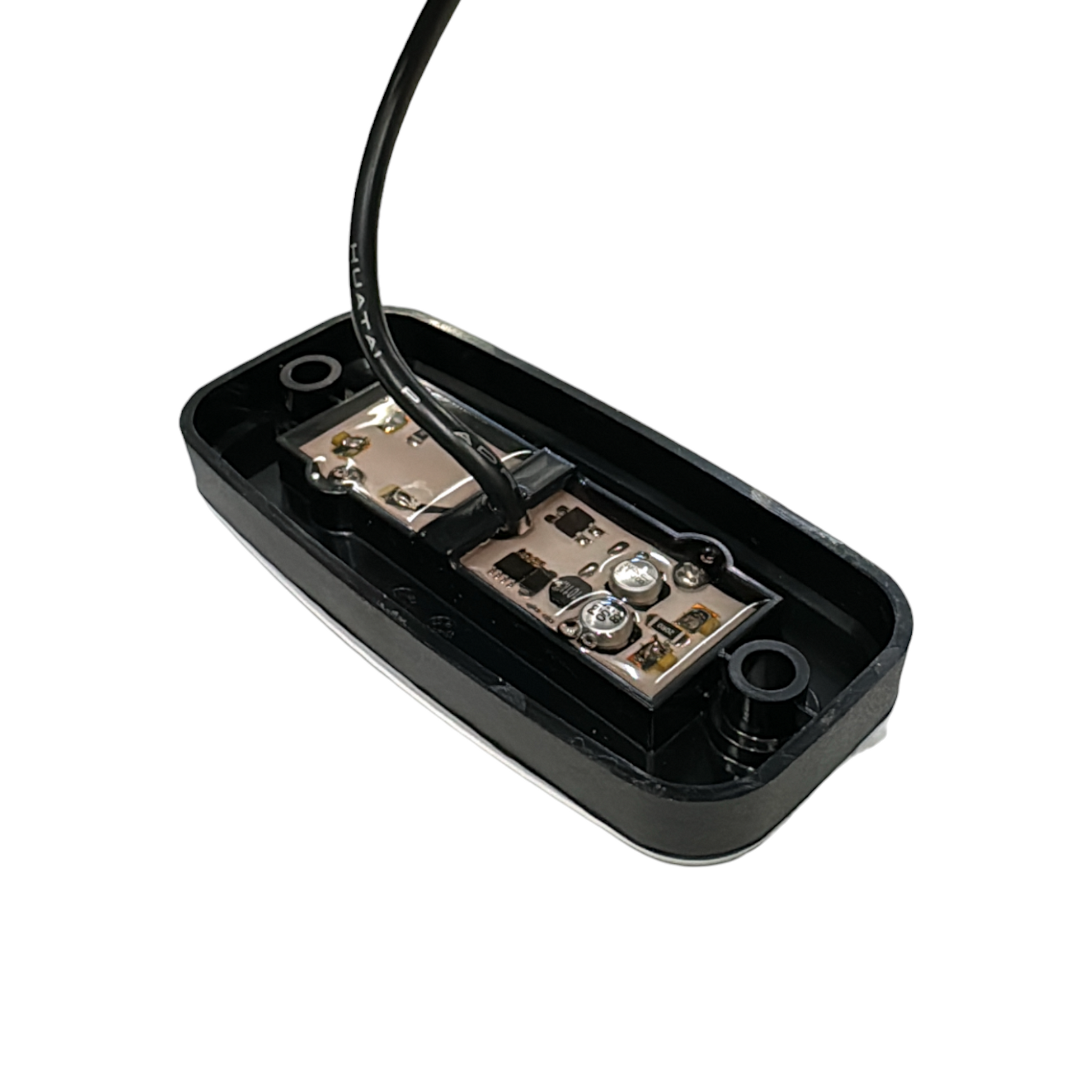 E-godkänd vit fiberoptisk positionsljuslampa med reflex inbyggt. Helt vattentät tack vare ultraljudssvetsningen vid kabelns ingång på baksidan. Levereras med 5meter kabel.