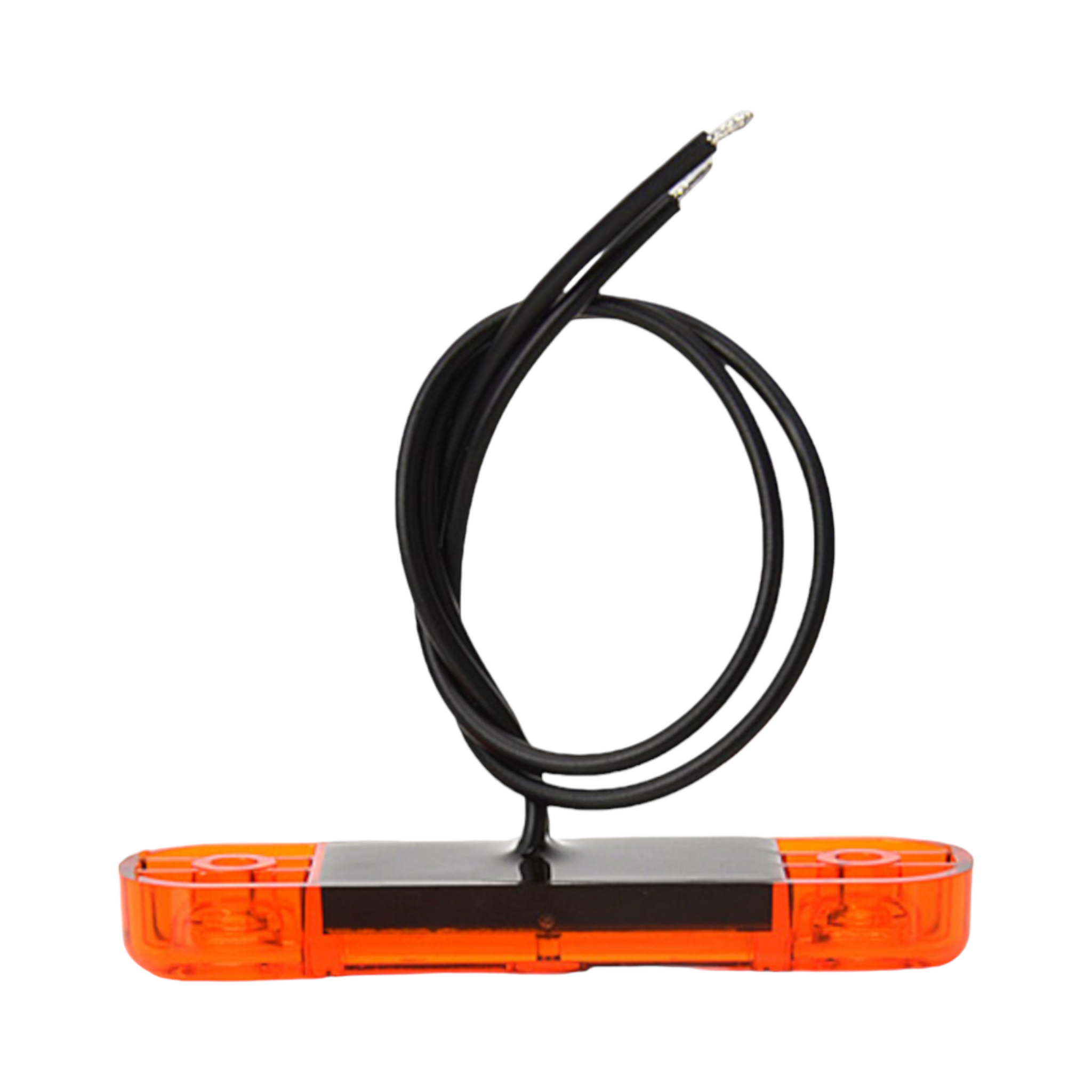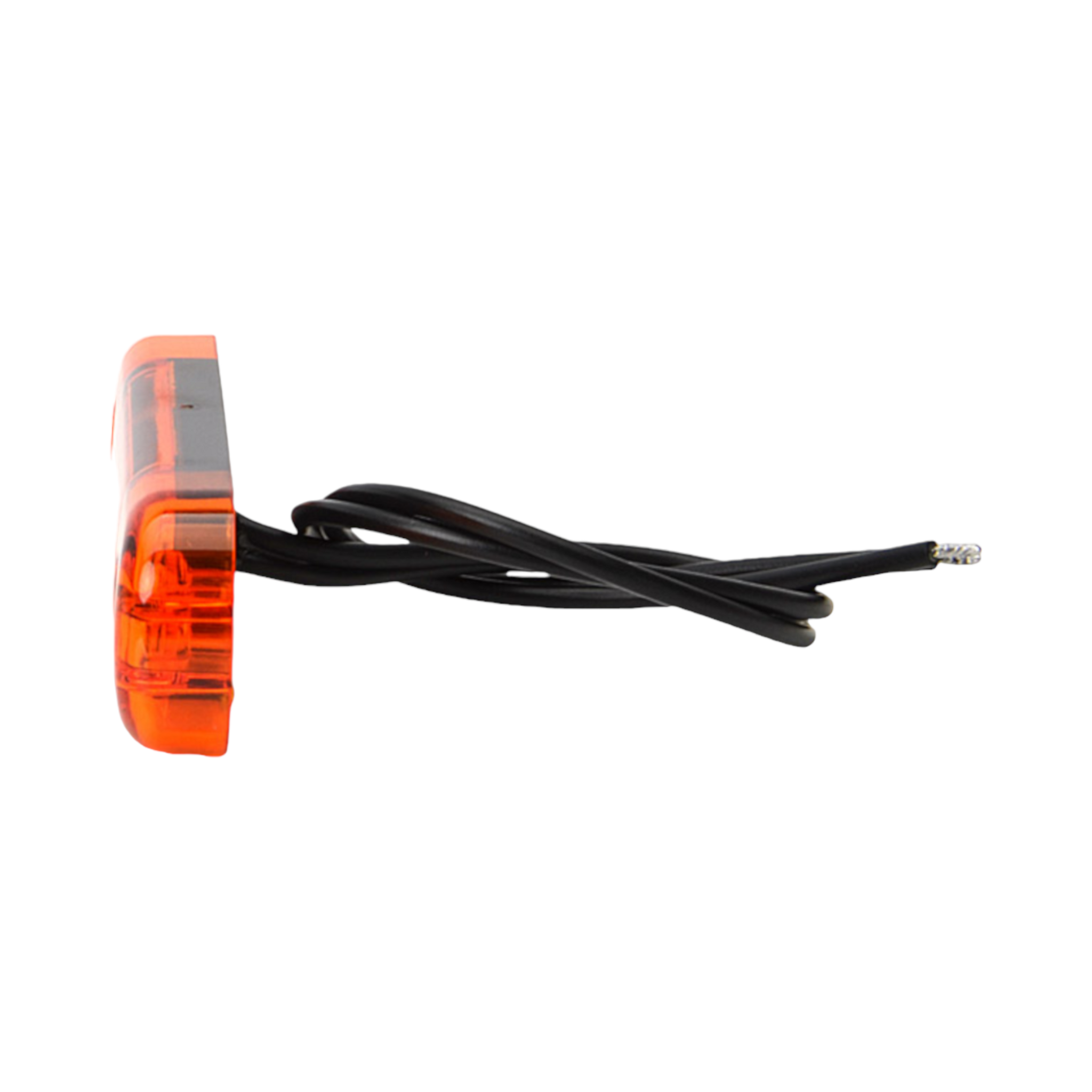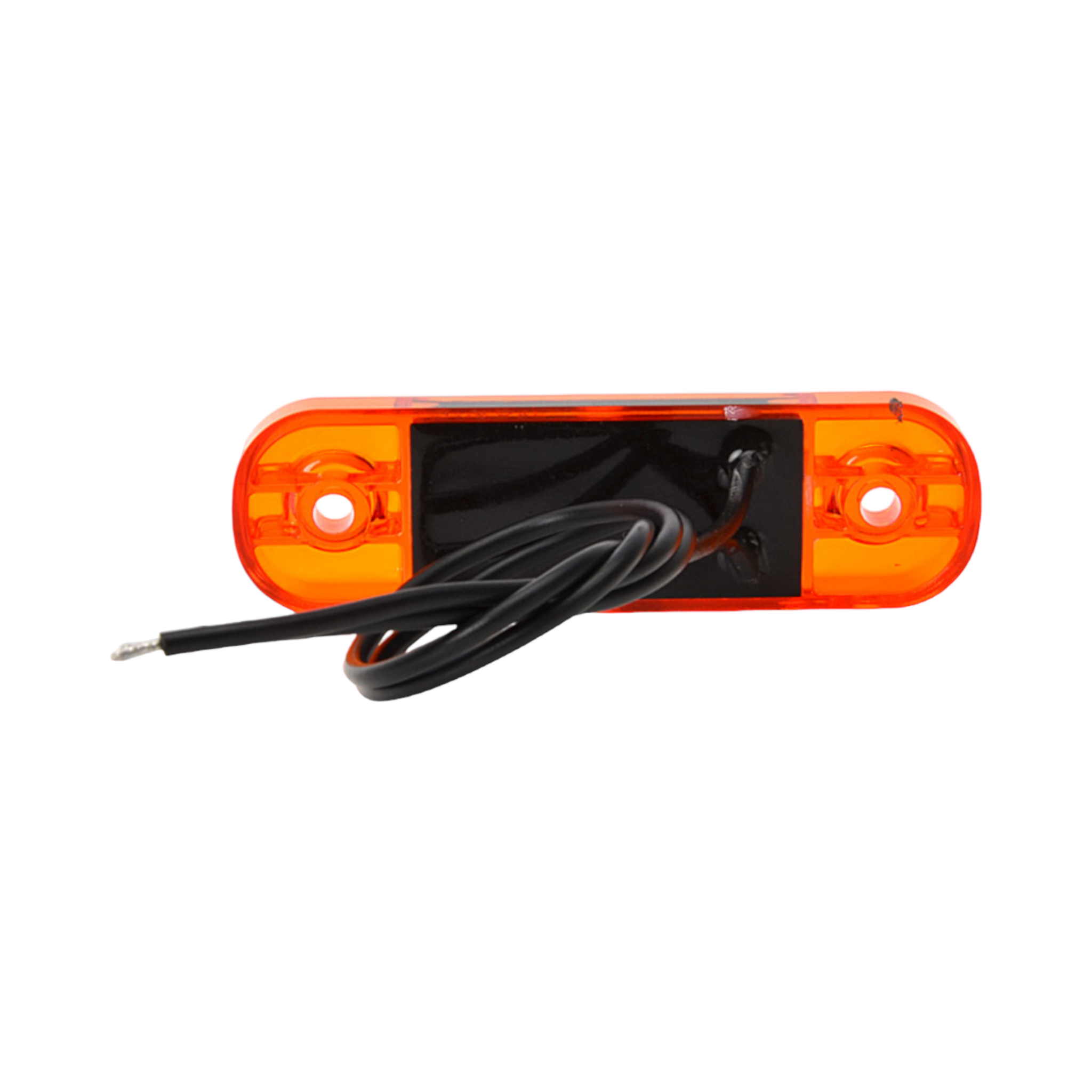 Slimmad Orange LED sidomarkeringslampa för utanpåliggande montage.E-godkänd. SPECIFIKATIONER Kabel (m): 0.4mBxHxD (mm): 84 x 24 x 10mmCC mått: 61mmDioder (st): 12stLamptyp: LEDAnslutning: KabelVolt (V): 12-24v