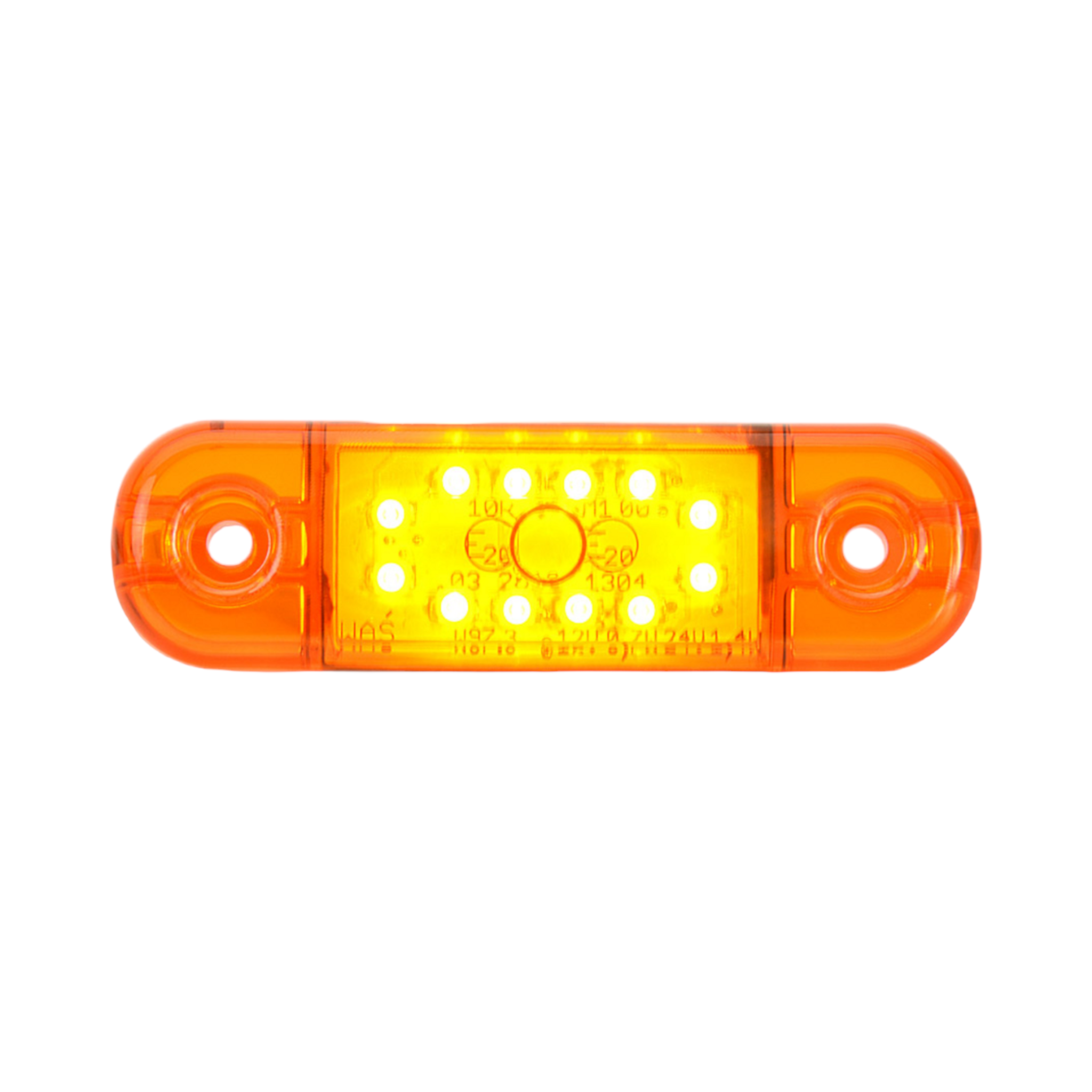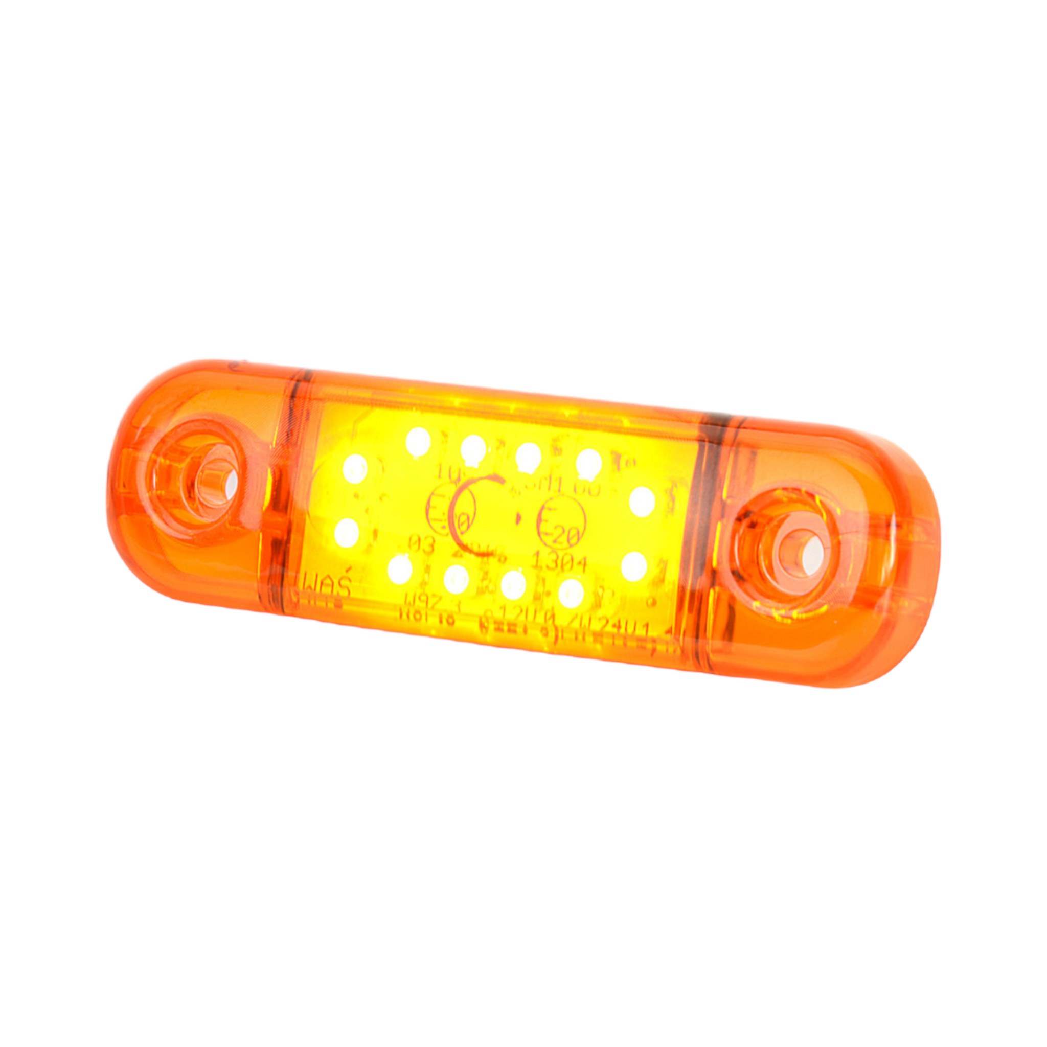 WAS Sidomarkering Slim Orange 12 LED 180 kr inkl. moms 2521301 Slimmad Orange LED sidomarkeringslampa för utanpåliggande montage.E-godkänd. SPECIFIKATIONER Kabel (m): 0.4mBxHxD (mm): 84 x 24 x 10mmCC mått: 61mmDioder (st): 12stLamptyp: LEDAnslutning: KabelVolt (V): 12-24v
