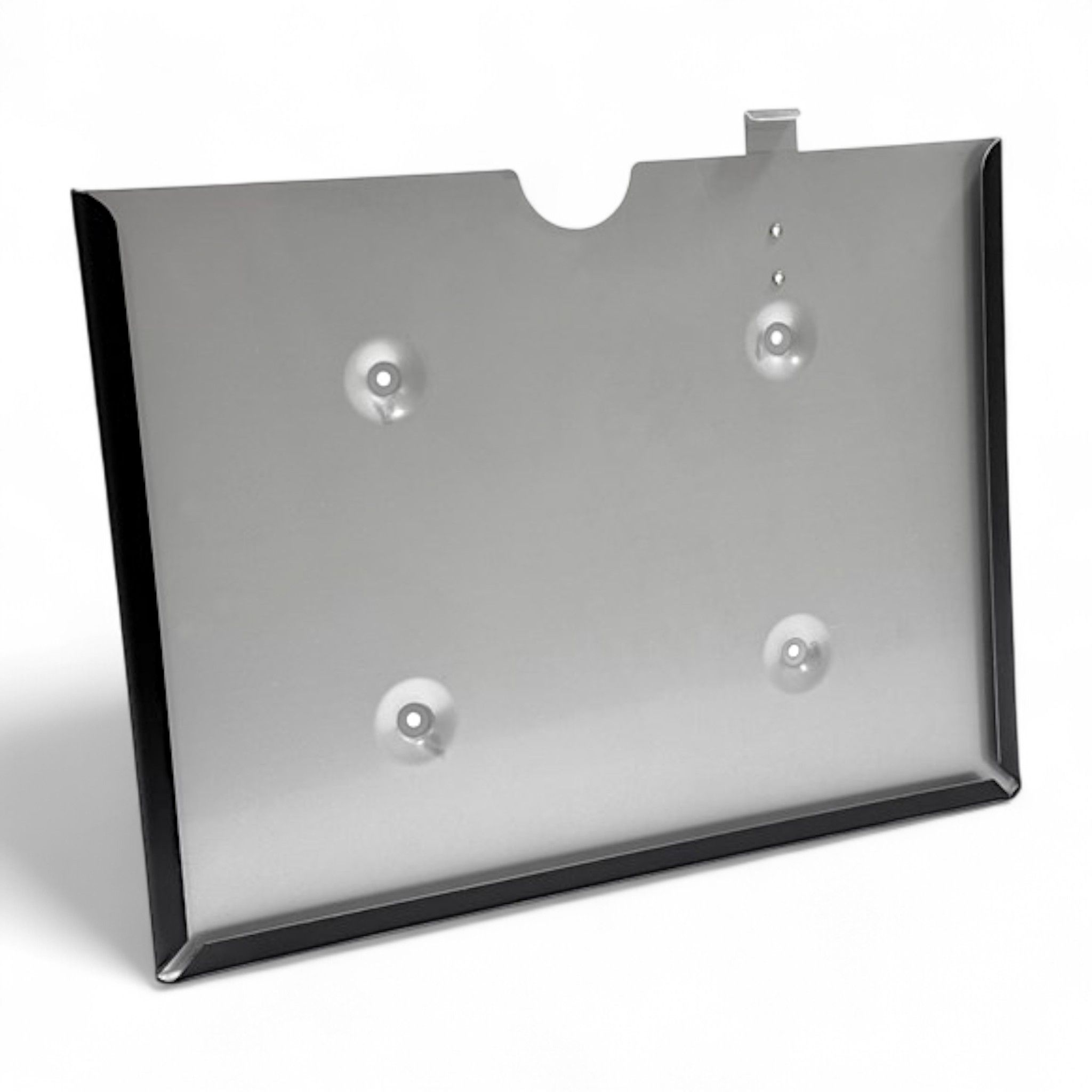 Observera: Hållare av aluminium är inte längre tillåtna. Denna hållare är tillverkad i rostfri stålplåt med svartlackerad baksida och levereras med integrerade clips.